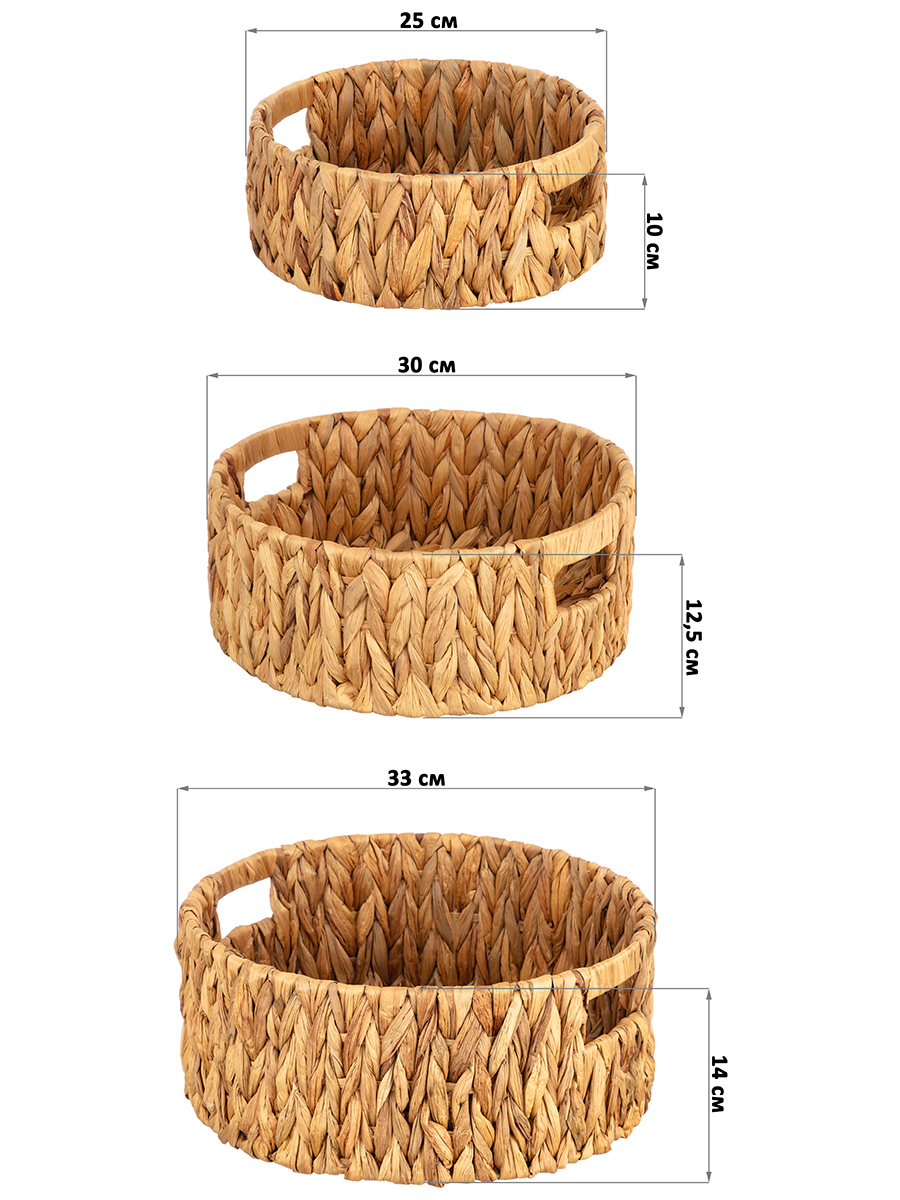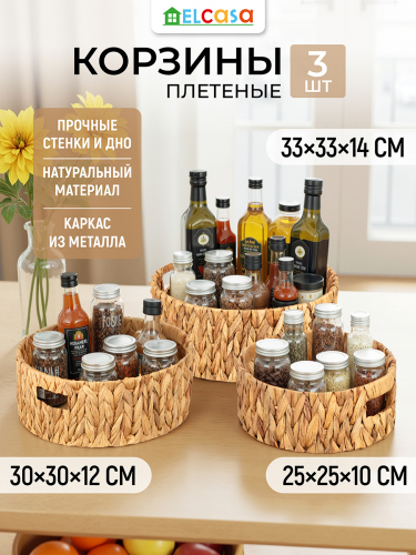Набор 3 плетёных корзин от ELCASA предназначен для организации системы хранения вещей в вашем доме. Включает изделия разных размеров: 25х25х10 см (внутренний размер – 23,5х23,5х9 см), 30х30х12,5 см (внутренний размер – 28,5х28,5х11 см) и 33х33х14 см (внутренний размер – 31х31х12,5 см). Прочные стенки корзинок представляют собой плетение из водного гиацинта – материала, устойчивого к влаге и перепадам температур. Такое преимущество позволяет использовать органайзеры на балконе или в ванной. Благодаря элегантному дизайну и универсальной круглой форме они будут не только практичным, но и привлекательным элементом декора и стильным дополнением вашего интерьера. Эстетичные плетёные корзиночки послужат контейнерамии для хранения мелочей и аксессуаров. Поставьте их на рабочий стол дома или в офисе в качестве настольных органайзеров, компактно разместив канцелярию или документы. Подойдут для хранения принадлежностей для художника, ниток для вышивания, швейного инвентаря и других предметов для творчества. На туалетном столике используйте их под косметику, лаки для ногтей, инструменты для макияжа и маникюра. На прикроватном столике храните в них ушные палочки, ватные диски и кремы для рук. Сложите в них провода, подвески, аксессуары и принадлежности для рукоделия. Прочные ручки помогут удобно переносить даже наполненные изделия. Корзиночки с экзотичным и натуральным дизайном преобразят интерьер кухни или гардеробной. Они послужат уникальным декоративным дополнением вашей квартиры или дома. В коллекции бренда ЭЛЬКАСА представлены разнообразные товары для дома, которые привнесут в ваш быт практичности и стиля.