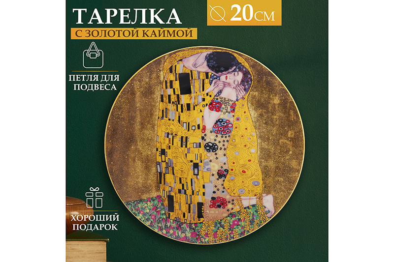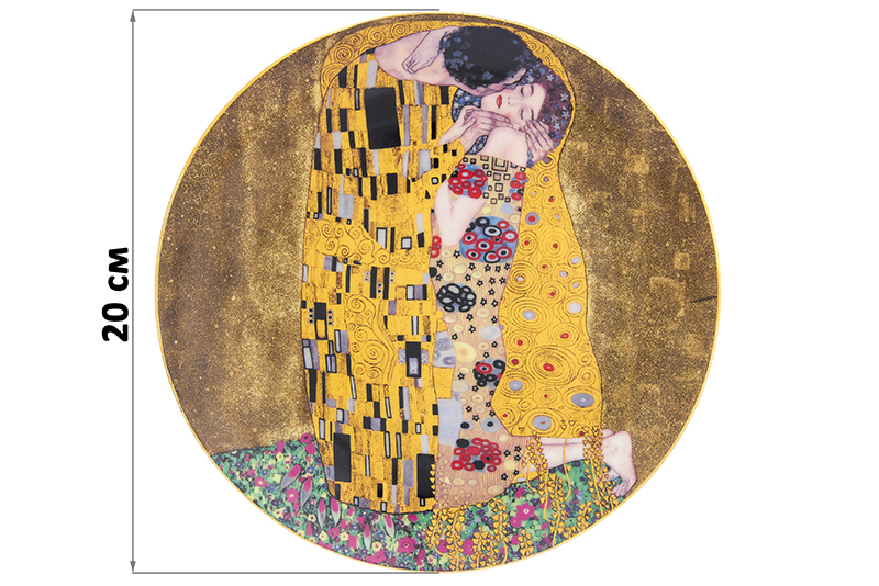 Тарелка декоративная Elan Gallery "Поцелуй" на подставке выполнена из качественного фарфора New Bone China и станет украшением интерьера вашей кухни, спальни или любой другой комнаты. Это фарфор нового поколения, не уступающий традиционному костяному по качеству, но при этом гораздо более экологичный в производстве. Размер блюдца – 20х20х2 см, диаметр – 20 см. Круглая тарелочка украшена рисунком с узнаваемым сюжетом картины Густава Климта и обрамлена золотым окаймлением. Имеет крючок для подвешивания, можно использовать как настенную. Разместите фарфоровое изделие на стене или полке в гостиной, чтобы украсить интерьер вашего дома. Удобная подставка в комплекте позволяет поставить её даже на стол или в шкаф. В серии тарелок с изображениями шедевров мировой живописи каждый может выбрать предмет декора на свой вкус. Не предназначается для приёма пищи. Не рекомендуется применять абразивные вещества, нельзя замачивать. Для очистки поверхности протрите изделие влажной тряпочкой. Тарелка с изящным рисунком на художественную тему упакована в красивую коробку и станет прекрасным подарком для ваших близких на любой праздник. Особенно понравится любителям искусства. Подарочная сувенирная тарелка Elan Gallery "Поцелуй" добавит нотки элегантности в любой интерьер и подчеркнет ваш изысканный вкус!