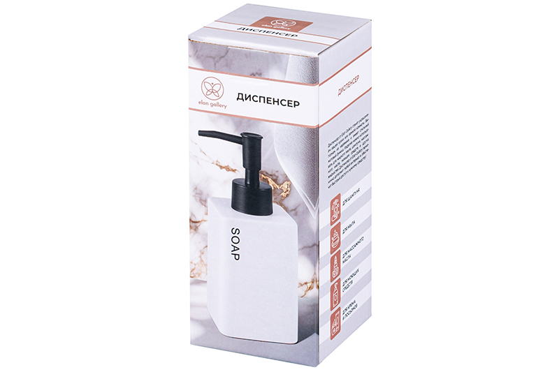 Диспенсер от бренда Elan Gallery белого цвета объёмом 310 мл и размером 6,7х6,7х16,3 см поможет организовать чистоту и уют в вашем доме. Украшен чёрной надписью "Soap" ("Мыло"). Стильный аксессуар в ванной или на кухне украсит интерьер, а также обеспечит быстрый доступ к средствам гигиены. Прямоугольная бутылочка выполнена из керамики. Дозатор на флаконе изготовлен из пластика. Объём керамической ёмкости 310 мл позволит налить в неё достаточно жидкости, чтобы хватило для длительного использования. Дозатор легко снимается и одевается, выдает нужную порцию мыла. Стильный органайзер подойдёт для использования на кухне или в ванной комнате. Налейте в него моющее средство, гель для мытья посуды или жидкое мыло. Эргономичная форма позволяет разместить флакон с дозатором на раковине или полке. В ванной можете использовать его для геля для душа или шампуня. Универсальную бутылочку с дозатором можно приспособить под антисептик. Просто поставьте её на стол, чтобы средство для дезинфекции было всегда под рукой. Ёмкость украсит интерьер любого пространства и позволит эстетично хранить различные жидкости или крем для тела. Не рекомендуется применять абразивные моющие средства. Нельзя мыть в посудомоечной машине. Поставляется в красочной картонной коробке. Станет оригинальным подарком на любой праздник. Благодаря фирменной коробочке не понадобится дополнительная подарочная упаковка. Настольный диспенсер — это не только практичное, но и стильное решение для организации чистоты и порядка в вашем доме. В коллекции бренда Элан Галерея представлено много стильных товаров для дома, выберите вариант на свой вкус!