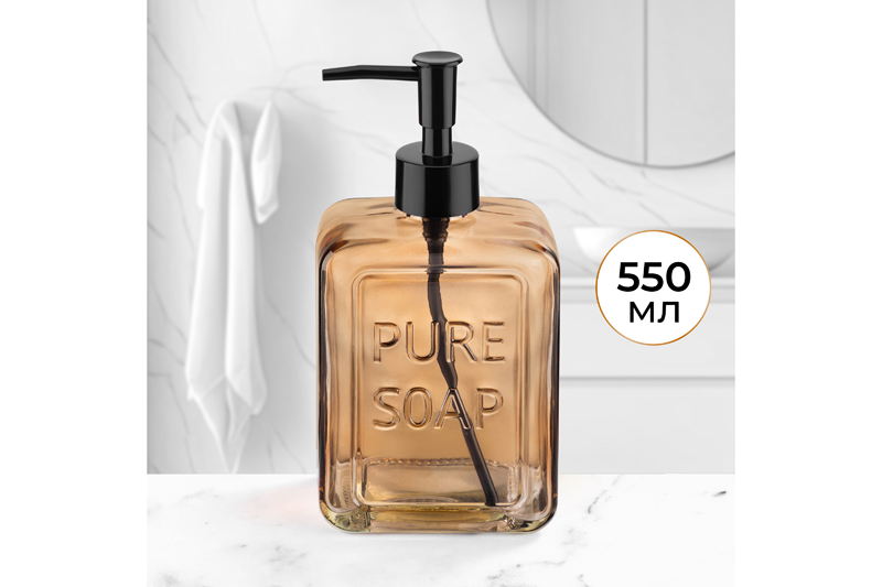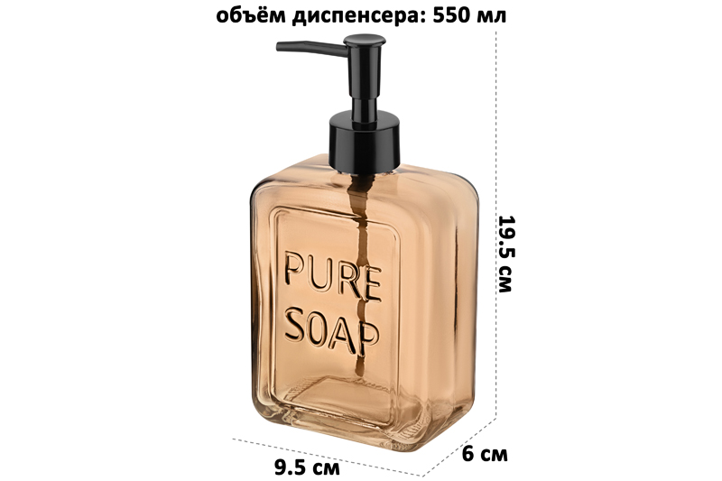 Диспенсер Elan Gallery "Песочный" объёмом 550 мл и размером 6х9,5х19,5 см поможет организовать чистоту и уют в вашем доме. Выполнен из стекла и украшен надписью "Pure soap" ("Чистое мыло"). Объём стеклянной бутылочки 550 мл позволит налить в неё достаточно средства, чтобы хватило для длительного использования. Дозатор диспенсера выполнен из пластика. Поскольку бутылка изготовлена из прозрачного стекла, вы можете контролировать уровень жидкости и вовремя пополнять её запас. Стильный органайзер подойдёт для использования на кухне или в ванной комнате. Налейте в него моющее средство, гель для мытья посуды или жидкое мыло. Эргономичная форма позволяет разместить флакон с дозатором на раковине или полке. В ванной можете использовать его для геля для душа или шампуня. Универсальную бутылочку с дозатором можно приспособить под антисептик. Просто поставьте её на стол, чтобы средство для дезинфекции было всегда под рукой. Ёмкость квадратной формы выполнена в стильном дизайне и подойдёт для любого интерьера. Инструкция: не применять абразивные моющие средства. Избегать регулярного прямого контакта с водой (например, не хранить в душевой кабинке или на полке возле душа). Поставляется в картонной упаковке. Настольный диспенсер — это не только практичное, но и стильное решение для организации чистоты и порядка в вашем доме.