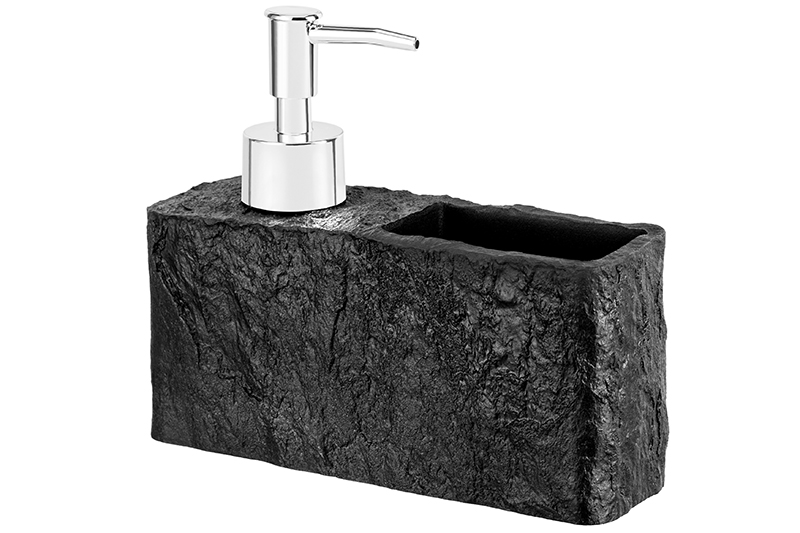 Настольный диспенсер от Elan Gallery подойдёт для хранения жидких моющих и очищающих средств. Размер изделия – 16,5х5,5х14 см, объём – 200 мл. Высота без дозатора – 9 см. Выполнен из полирезина – современного материала, отличающегося лёгкостью и устойчивостью к влаге. Он не выделяет вредных веществ и не впитывает посторонние запахи. Благодаря высокой прочности изделие надолго сохранит привлекательный внешний вид. Чёрная поверхность визуально имитирует природный сланец. Дозатор серебристого цвета выполнен из пластика. Он герметичен и надёжно предотвращает проливание. Благодаря красивому дизайну и необычной форме баночка найдёт место в любой части вашей квартиры. Заполните ёмкость жидким мылом или средством для посуды и расположите на кухонной раковине. Имеется отделение для губки – с ним вы можете компактно хранить всё необходимое для мытья посуды. В ванной используйте флакон под гель для душа или шампунь. Универсальную бутылочку можно приспособить под антисептик. Поставьте её на рабочий стол в своей комнате или кабинете, чтобы дезинфицирующее средство было под рукой. Дополнительное отделение можно применить для хранения салфеток, тряпочки для протирки экрана или мелких канцелярских принадлежностей. Не рекомендуется применять абразивные моющие средства. Не подходит для использования в посудомоечной машине. Для очистки изделия воспользуйтесь тёплой водой с добавлением моющего средства. Поставляется в дизайнерской картонной коробке – вам не потребуется дополнительная подарочная упаковка. Декоративный диспенсер от бренда Элан Галерея станет отличным подарком для родных и близких. Это не только практичный, но и эстетичный аксессуар для поддержания гигиены, подходящий под любой интерьер!