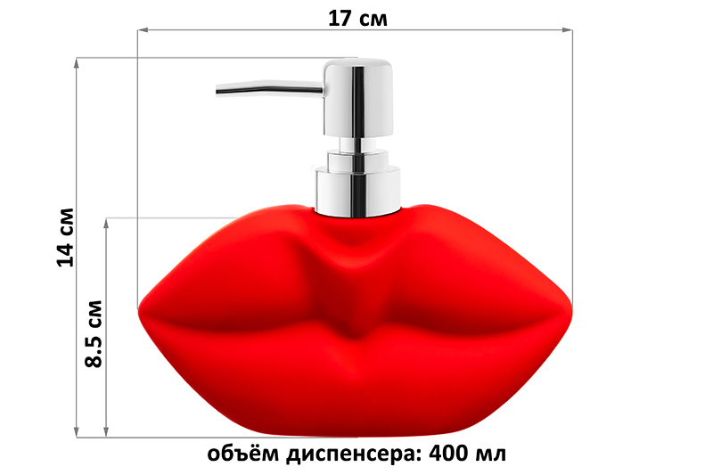 Диспенсер Elan Gallery в виде алых губ объёмом 400 мл и размером 17х7х14 см поможет организовать чистоту и уют в вашем доме. Яркий аксессуар в ванной или на кухне добавит красок в интерьер. Фигурная бутылочка выполнена из керамики. Имеет матовый финиш, создающий эффект soft-touch. Дозатор серебристого цвета изготовлен из пластика. Высота без дозатора 9,5 см. Объём керамической ёмкости 400 мл позволит налить в неё достаточно средства, чтобы хватило для длительного использования. Дозатор легко снимается и одевается, выдает нужную порцию мыла. Стильный органайзер подойдёт для использования на кухне или в ванной комнате. Налейте в него моющее средство, гель для мытья посуды или жидкое мыло. Эргономичная форма позволяет разместить флакон с дозатором на раковине или полке. В ванной можете использовать его для геля для душа или шампуня. Универсальную бутылочку с дозатором можно приспособить под антисептик. Просто поставьте её на стол, чтобы средство для дезинфекции было всегда под рукой. Ёмкость в форме красных женских губ украсит интерьер любого пространства. Не рекомендуется применять абразивные моющие средства. Нельзя мыть в посудомоечной машине. Поставляется в красочной картонной коробке. Станет оригинальным подарком на любой праздник. Благодаря фирменной коробочке не понадобится дополнительная подарочная упаковка. Настольный диспенсер — это не только практичное, но и стильное решение для организации чистоты и порядка в вашем доме. В коллекции бренда Элан Галерея представлено много стильных товаров для дома, в том числе эстетичных принадлежностей для хранения различных жидкостей или крема. Выберите вариант на свой вкус!