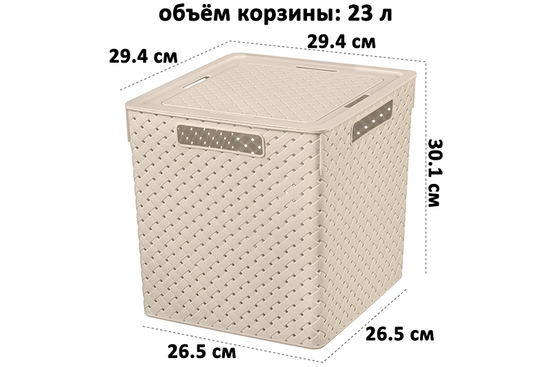 Корзина с крышкой от ELCASA имеет цвет латте. Размер изделия – 29,4х29,4х30,1 см, объём – 23 литра. Размер дна – 26,5х26,5 см. Универсальный дизайн и благородный цвет добавят стиля вашему интерьеру. Органайзер выполнен из полипропилена и станет незаменимым помощником для организации порядка в гардеробной, в комнате или на кухне. Преимущество данного материала над обычным пластиком заключается в его лёгкости и безопасности для здоровья. Используйте пластиковый контейнер для хранения как овощей и фруктов, так и кухонных и хозяйственных принадлежностей. Храните в ней косметику, бытовую химию или моющие средства, расположив в шкафчике или на открытом пространстве. Декоративное плетение с отверстиями обеспечивает циркуляцию воздуха и предотвращает порчу продуктов от недостатка кислорода. Удобные ручки облегчат перенос даже наполненного изделия. Крышка надёжно защитит содержимое от попадания грязи и пыли. Корзину можно использовать для белья, полотенец, одежды и различных мелочей. Поставьте короб под раковину в ванной, возле стиральной машины или на полку. Разместите в детской комнате в качестве ящика для игрушек. Храните в ней садовые инструменты или используйте в гараже, на складе или на балконе под разнообразный инвентарь. Подойдёт для компактной перевозки вещей в багажнике машины. Не рекомендуется применять абразивные моющие средства. В ассортименте бренда ЭЛЬКАСА представлены корзинки разных объёмов, форм и цветов, что позволит собрать уникальный набор, отвечающий вашим потребностям. Создайте систему хранения в едином стиле и эффективно используйте каждый сантиметр пространства!