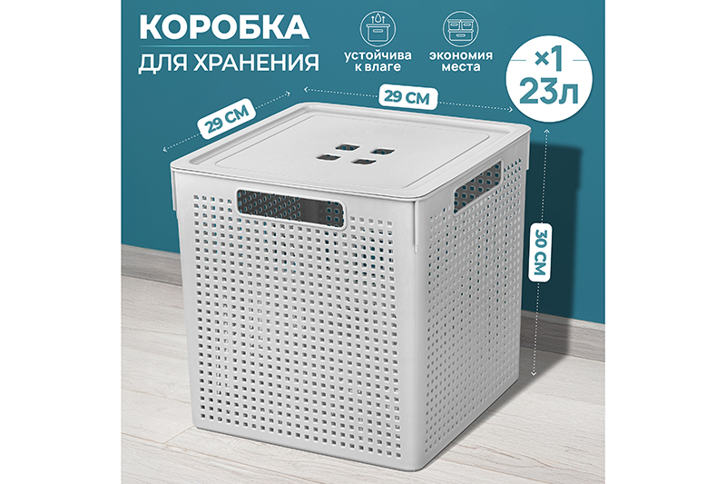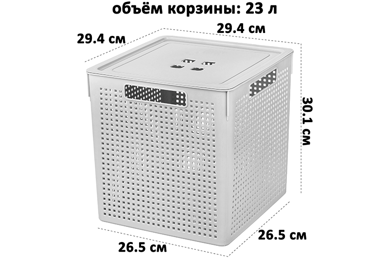 Корзина с крышкой от ELCASA имеет светло-серый цвет. Размер изделия – 29,4х29,4х30,1 см, объём – 23 литра. Размер дна – 26,5х26,5 см. Универсальный дизайн и благородный цвет добавят стиля вашему интерьеру. Органайзер выполнен из полипропилена и станет незаменимым помощником для организации порядка в гардеробной, в комнате или на кухне. Преимущество данного материала над обычным пластиком заключается в его лёгкости и безопасности для здоровья. Используйте пластиковый контейнер для хранения как овощей и фруктов, так и кухонных и хозяйственных принадлежностей. Храните в ней косметику, бытовую химию или моющие средства, расположив в шкафчике или на открытом пространстве. Декоративное плетение с отверстиями обеспечивает циркуляцию воздуха и предотвращает порчу продуктов от недостатка кислорода. Удобные ручки облегчат перенос даже наполненного изделия. Крышка надёжно защитит содержимое от попадания грязи и пыли. Корзину можно использовать для белья, полотенец, одежды и различных мелочей. Поставьте короб под раковину в ванной, возле стиральной машины или на полку. Разместите в детской комнате в качестве ящика для игрушек. Храните в ней садовые инструменты или используйте в гараже, на складе или на балконе под разнообразный инвентарь. Подойдёт для компактной перевозки вещей в багажнике машины. Не рекомендуется применять абразивные моющие средства. В ассортименте бренда ЭЛЬКАСА представлены корзинки разных объёмов, форм и цветов, что позволит собрать уникальный набор, отвечающий вашим потребностям. Создайте систему хранения в едином стиле и эффективно используйте каждый сантиметр пространства!