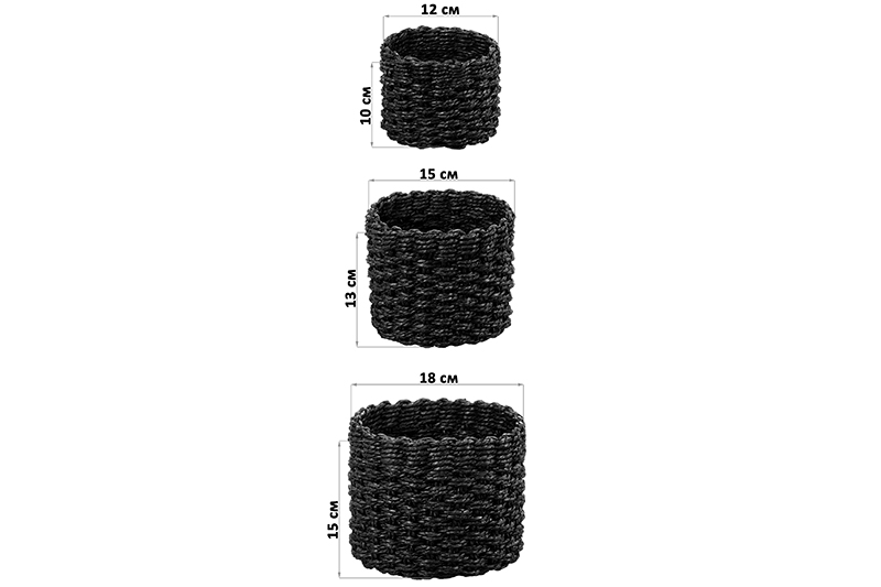 Набор 3 плетёных корзинок от ELCASA предназначен для организации практичной системы хранения вещей в вашем доме. Включает изделия разных размеров: 12х12х10 см, 15х15х13 см и 18х18х15 см. Выполнены из натуральных материалов с декоративным плетением, которое визуально напоминает ротанг и перекликается с эстетикой изделий из джутовых нитей. При этом корзины сохраняют свою лёгкость и экологичность. Лаконичный графитовый цвет и мягкая круглая форма придают им элегантный вид, делая не только функциональным, но и привлекательным элементом декора и стильным дополнением вашего интерьера. Различие органайзеров по размеру позволит разделить аксессуары на категории и облегчит их поиск. Используйте их для проводов от зарядных устройств, наушников, заколок, резинок для волос. Контейнеры создадут уют в любой комнате. Разместите их на полке для хранения разнообразных мелочей. В прихожей они помогут компактно сложить ключи, перчатки и визитки. В спальне заполните их кремами, ватными дисками или ушными палочками. Расположите на туалетном столике под наборы для макияжа, инструменты для маникюра, уходовую косметику и ювелирные подвески. Приспособьте для художественных принадлежностей и приборов для рукоделия: кисточек, ниток или пряжи. Настольные органайзеры послужат в качестве офисных, помогая держать под рукой канцелярию – ручки, карандаши и блоки записных листов. Не рекомендуется применять абразивные моющие средства. Корзиночки от бренда ЭЛЬКАСА станут практичным и оригинальным подарком для близких, друзей и коллег, а также универсальным дополнением вашего дома. С ними доступ к вашим вещам станет простым и удобным!