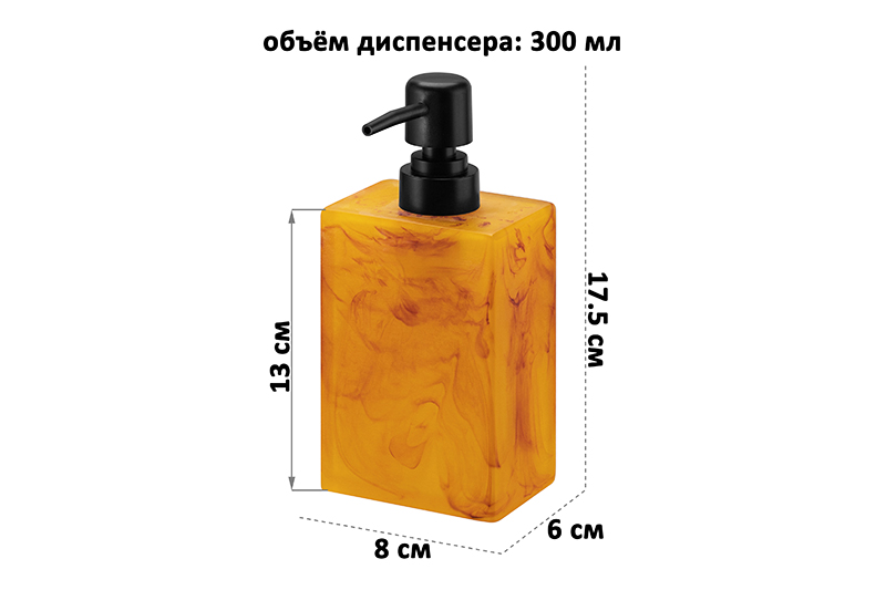 Настольный диспенсер от Elan Gallery подойдёт для хранения жидких моющих и очищающих средств. Размер изделия – 8х6х17,5 см, объём – 300 мл. Высота без дозатора – 13 см. Выполнен из полирезина – современного материала, отличающегося лёгкостью и устойчивостью к влаге. Он не выделяет вредных веществ и не впитывает посторонние запахи. Благодаря высокой прочности изделие надолго сохранит привлекательный внешний вид. Его оранжевая поверхность напоминает природный янтарь. Дозатор чёрного цвета выполнен из пластика. Он герметичен и надёжно предотвращает проливание. Благодаря красивому дизайну и необычной форме баночка найдёт место в любой части вашей квартиры. Заполните ёмкость жидким мылом или средством для посуды и расположите на кухонной раковине. В ванной используйте флакон под гель для душа или шампунь. Универсальную бутылочку можно приспособить под антисептик. Поставьте её на рабочий стол в своей комнате или кабинете, чтобы дезинфицирующее средство было под рукой. Не рекомендуется применять абразивные моющие средства. Не подходит для использования в посудомоечной машине. Для очистки изделия воспользуйтесь тёплой водой с добавлением моющего средства. Поставляется в дизайнерской картонной коробке – вам не потребуется дополнительная подарочная упаковка. Декоративный диспенсер от бренда Элан Галерея станет отличным подарком для родных и близких. Это не только практичный, но и эстетичный аксессуар для поддержания гигиены, подходящий под любой интерьер!