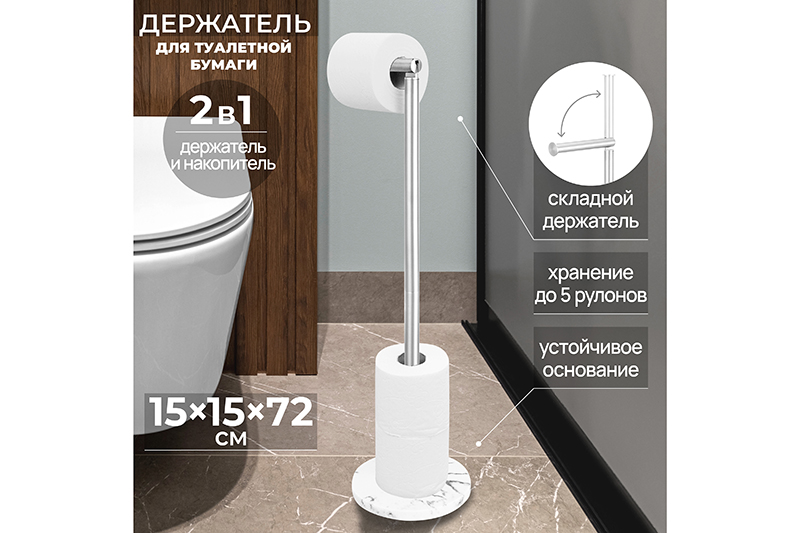 Держатель для туалетной бумаги ELCASA "Белый" выполнен из нержавеющей стали, имеет круглое основание (подставку) из полирезина. С обратной стороны подставки есть маленькие антискользящие накладки круглой формы, которые гарантируют устойчивость держателя даже на очень гладкой поверхности. Вмещает до 5 запасных рулонов туалетной бумаги на накопителе серебристого цвета. Полирезин – это современный материал, который славится своей долговечностью, устойчивостью к влаге и не выделяет вредных веществ. Горизонтальный подвес для рулона поднимается вверх. Полный размер держателя с поднятым вверх подвесом – 15х15х72 см. Высота в собранном виде (с отогнутым горизонтально подвесом) – 60 см. Длина горизонтального подвеса для рулонов – 14 см. Диаметр металлической трубы – 2 см. Белое полирезиновое основание украшено рисунком с имитацией мраморной поверхности. Вертикальный стальной держатель имеет серебряный оттенок. Подставка подойдет к любому интерьеру ванной или туалета, от минимализма до лофт. За счёт эргономичной формы кронштейну найдется место даже в небольшой кабинке туалета. Высокий органайзер устойчив на полу и не требует дополнительных действий при установке. Просто поставьте его на пол в санузел рядом с унитазом без всякого сверления, тогда все необходимые предметы гигиены будут под рукой. Не рекомендуется применять абразивные моющие средства. Поставляется в красочной картонной коробке. Бумагодержатель станет незаменимым помощником для создания комфорта в вашем доме и поможет держать все необходимые средства гигиены под рукой!