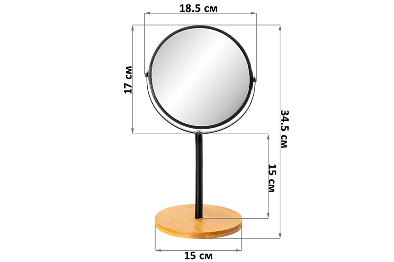 Двустороннее круглое зеркало от ELCASA имеет сторону со стандартным отражением и сторону с двукратным увеличением. Общий размер изделия с подставкой – 18,5х15х34,5 см, размер подставки – 15х15х1,5 см. Длина ножки – 15 см (не регулируется по высоте). Диаметр зеркальной поверхности – 17 см. Угол наклона регулируется, изделие вращается на 360 градусов. Элегантная подставка выполнена из натурального бамбука. Увеличивающая сторона обеспечит удобство при проведении косметических процедур. Компактное настольное зеркальце чёрного цвета станет функциональным аксессуаром и стильным дополнением вашего дома. Разместите его на туалетном столике или полке в своей спальне или ванной комнате. Поставьте на тумбочку рядом с косметическими принадлежностями, чтобы держать всё необходимое под рукой. Зеркальце станет помощником при ежедневном туалете, нанесении макияжа или масок для лица. Мужчинам подойдёт для бритья. Универсальный аксессуар будет удобным элементом инвентаря визажистов и гримёров. Не рекомендуется применять абразивные моющие средства. Поставляется в дизайнерской картонной коробке – благодаря ей вам не потребуется дополнительная подарочная упаковка. Крутящееся зеркало станет отличным подарком для женщин и мужчин, а универсальный дизайн впишет его в любой интерьер. Двустороннее зеркальце с увеличительной стороной от бренда ЭЛЬКАСА послужит стильным элементом декора для интерьера вашего дома и поможет поддерживать вашу красоту в течение дня!
