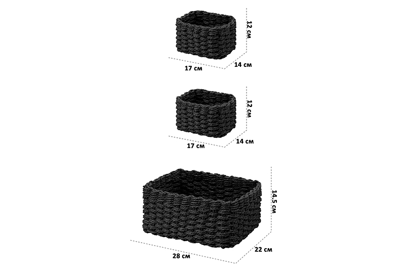 Набор 3 плетёных корзинок от ELCASA предназначен для организации практичной системы хранения вещей в вашем доме. Включает изделия разных размеров: одну корзинку размером 28х22х14,5 см и две корзинки размером 17х14х12 см. Выполнены из натуральных материалов с декоративным плетением, которое визуально напоминает ротанг и перекликается с эстетикой изделий из джутовых нитей. При этом корзины сохраняют свою лёгкость и экологичность. Лаконичный графитовый цвет придаёт им элегантный вид, делая не только функциональным, но и привлекательным элементом декора и стильным дополнением вашего интерьера. Различие органайзеров по размеру позволит разделить аксессуары на категории и облегчит их поиск. Используйте их для проводов от зарядных устройств, наушников, заколок, резинок для волос. Контейнеры создадут уют в любой комнате. Разместите их на полке для хранения разнообразных мелочей. В прихожей они помогут компактно сложить ключи, перчатки и визитки. В спальне заполните их кремами, ватными дисками или ушными палочками. Расположите на туалетном столике под наборы для макияжа, инструменты для маникюра, уходовую косметику и ювелирные подвески. Приспособьте для художественных принадлежностей и приборов для рукоделия: кисточек, ниток или пряжи. Настольные органайзеры послужат в качестве офисных, помогая держать под рукой канцелярию – ручки, карандаши и блоки записных листов. Не рекомендуется применять абразивные моющие средства. Корзиночки от бренда ЭЛЬКАСА станут практичным и оригинальным подарком для близких, друзей и коллег, а также универсальным дополнением вашего дома. С ними доступ к вашим вещам станет простым и удобным!