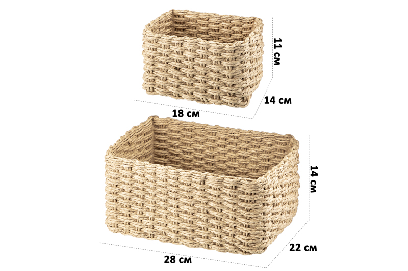 Набор 3 плетённых корзин предназначен для организации хранения в вашем доме. Размер одного изделия – 28х22х14 см, двух других – 18х14х11 см каждое. Выполнены из бумаги, имеют прочные стенки и дно. Плетёный дизайн придаёт им элегантный вид, делая не только функциональным, но и стильным элементом декора для вашего интерьера. Разнообразие размеров органайзеров позволяет делить аксессуары на категории и облегчить поиск. Бумажные контейнеры помогут создать уют в любой части вашей квартиры. Заполните настольные косметички предметами уходовой и декоративной косметики, лаками для ногтей и маникюрными аксессуарами. Расставьте их на туалетном столике, чтобы хранить резинки для волос и заколки, флакончики с духами, подвески, кремы, помады, ватные палочки и диски. Универсальные корзинки станут незаменимым предметом инвентаря визажистов. На рабочем столе позволят компактно хранить художественные принадлежности, канцелярию и приборы для рукоделия: ручки, кисточки, пряжу, карандаши или блоки записных листов. Аккуратно сложите в них проводные наушники, инструменты для вязания и творчества. Послужат в качестве аптечки для таблеток, мазей и других лекарств. На кухне помогут держать по рукой баночки с приправами и специями. Разместите их на полке или в шкафу под любые мелочи. Не рекомендуется применять абразивные моющие средства. Корзиночки станут практичным и оригинальным подарком для близких, друзей и коллег, а также универсальным дополнением вашего дома. С ними доступ к вашим вещам станет простым и удобным!