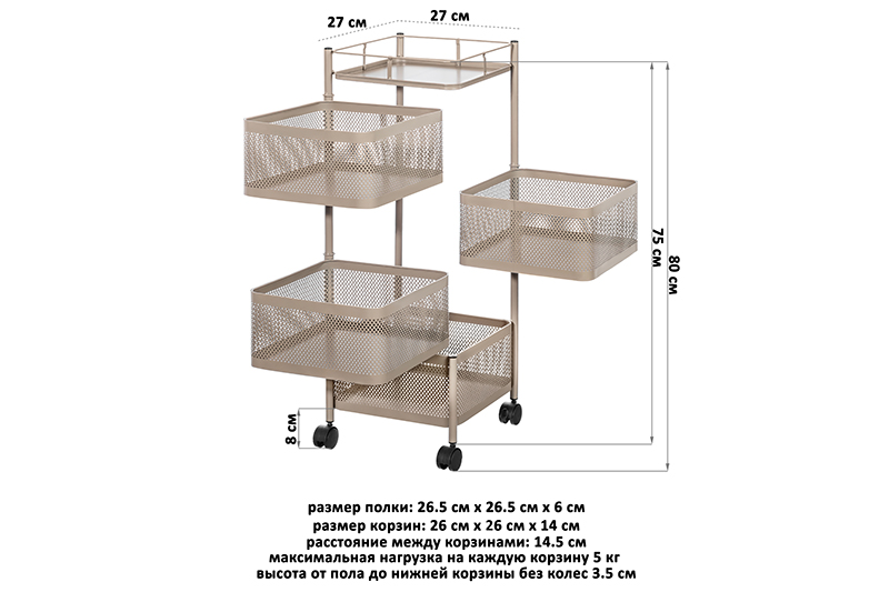 Четырёхъярусная этажерка ELCASA "Серо-коричневая" размером 27х27х80 см на 4 колесах поможет создать порядок и организовать систему хранения в вашем доме. Размер этажерки без колесиков 27х27х75 см. Выполнена из металла. Размер каждого прямоугольного ящичка – 26х26х14 см, расстояние между ящиками – 2 см. Максимальная нагрузка на одну полочку – 5 кг. Высота от пола до нижней корзины без колес 3 см, с колесами – 7,5 см. Квадратные отсеки вращаются вокруг оси. Благодаря колесикам стеллаж с полочками удобно перемещать из одной комнаты в другую. Система тормоза в виде фиксаторов на 2 колесах позволит устойчиво закрепить положение этажерки в нужном месте. Мебель имеет универсальный дизайн, подойдёт к интерьеру в любом стиле. Мобильную этажерку с корзинками можно использовать для хранения вещей в комнате, на кухне и даже в детской. В прихожей можно положить в неё аксессуары: шапки, перчатки и шарфы. Подойдёт в роли обувницы для обуви и тапочек. Высокая этажерка с ящиками будет незаменима в гардеробной или на балконе в роли тумбы. На кухне можно использовать её для хранения овощей и фруктов. Каждая корзина может быть использована под разные фрукты и овощи. Декоративные отверстия на стенках позволяют воздуху проникать внутрь и не дадут продуктам испортиться от недостатка кислорода. В ванной подойдёт для хранения косметичек, бытовой химии или полотенец. Просто поставьте её возле раковины или стиральной машинки. В комнате в неё можно сложить книги, записные книжки или игрушки, используя как маленький шкафчик. В спальне послужит оригинальным туалетным столиком для баночек с косметикой. Можно использовать как прикроватную тумбочку, поставив на неё растения, лампу или предметы декора. В коллекции бренда ELCASA представлены функциональные органайзеры и другие товары для дома. Выберите вариант на свой вкус для создания комфорта в квартире и на даче.