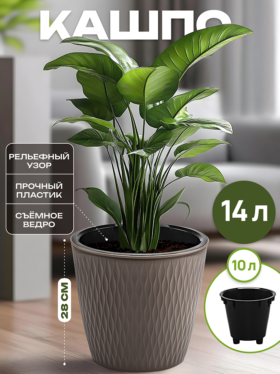 Напольное кашпо для цветов от ELCASA предназначено для организации пространства в вашем доме. Состоит из 2-х частей: внешней высокой подставки серо-коричневого цвета и внутреннего съёмного горшка чёрного цвета. Размер кашпо – 31х31х28 см, объём – 14,2 литра, размер дна – 21,5х21,5 см. Размер ведра-вкладыша – 30х30х27 см, размер дна – 19,5х19,5 см. Выполнено из полипропилена – прочного пластика, который не содержит бисфенол А и другие вредные вещества. Подойдёт под любой цветок. Ваза со вставкой покрыта краской, устойчивой к ультрафиолету, поэтому пригодна для использования как дома, так и на улице. Разместите кашпо на даче или балконе – горшочек не выгорит на солнце и долго прослужит. Большая пластиковая подставка имеет стильную круглую форму и сможет украсить не только квартиру, но и сад. Кашпо подойдёт как для искусственный, так и для живых комнатных цветов. В интерьерной вазе будет изящно смотреться пальма, фикус, папоротник и орхидея. Поставьте её на пол или посадите в неё своё любимое деревце, чтобы создать в комнате атмосферу тепла и уюта. Большой горшок для цветов займёт прекрасное место на вашей кухне, добавив интерьеру очарования благодаря наличию живых растений. Кашпо из прочного материала достаточно устойчиво, но при необходимости на дне можно расположить утяжелители (не входят в набор). Не рекомендуется применять абразивные моющие средства. Декоративное кашпо от ЭЛЬКАСА станет украшением вашего дома, сада или офиса и поможет создать в них гармонию и уют!