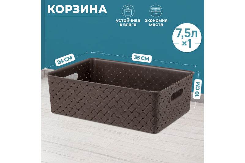 Корзина от ELCASA имеет тёмно-коричневый цвет. Размер изделия – 35х24,5х10,5 см, объём – 7,5 литра. Размер дна – 32,5х21,5 см. Универсальный дизайн и благородный цвет добавят стиля вашему интерьеру. Органайзер выполнен из полипропилена и станет незаменимым помощником для организации порядка в гардеробной, в комнате или на кухне. Преимущество данного материала над обычным пластиком заключается в его лёгкости и безопасности для здоровья. Используйте пластиковый контейнер для хранения как овощей и фруктов, так и кухонных и хозяйственных принадлежностей. Храните в ней косметику, бытовую химию или моющие средства, расположив в шкафчике или на открытом пространстве. Декоративное плетение с отверстиями обеспечивает циркуляцию воздуха и предотвращает порчу продуктов от недостатка кислорода. Удобные ручки облегчат перенос даже наполненного изделия. Корзину можно использовать для белья, полотенец, одежды и различных мелочей. Поставьте короб под раковину в ванной, возле стиральной машины или на полку. Разместите в детской комнате в качестве ящика для игрушек. Храните в ней садовые инструменты или используйте в гараже, на складе или на балконе под разнообразный инвентарь. Подойдёт для компактной перевозки вещей в багажнике машины. Не рекомендуется применять абразивные моющие средства. В ассортименте бренда ЭЛЬКАСА представлены корзинки разных объёмов, форм и цветов, что позволит собрать уникальный набор, отвечающий вашим потребностям. Создайте систему хранения в едином стиле и эффективно используйте каждый сантиметр пространства!