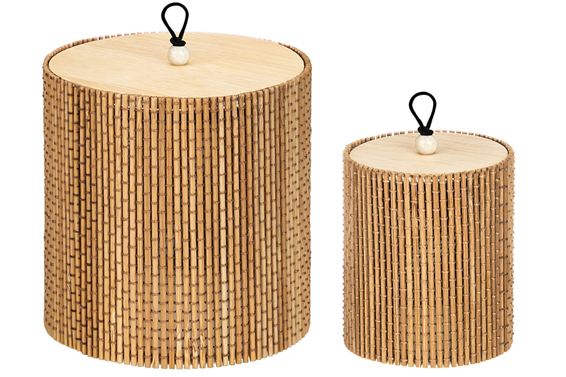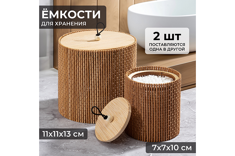 Набор 2 круглых ёмкостей для хранения размерами 11,5х11,5х13 см и 7,5х7,5х10 см от бренда ELCASA изготовлен из натурального бамбука. Обратите внимание при получении заказа: комплектация полная, контейнер поменьше поставляется внутри контейнера побольше. Имеют ручки в виде петелек и бамбуковые крышки. Размер банок без крышек 11,5х11,5х12 см и 7,5х7,5х9 см. Натуральный цвет изделий и экологичный материал в составе подчеркивают органичность и гармонию с окружающей средой. Стенки каждого изделия выполнены из бамбуковых палочек. Органайзер можно использовать для хранения любых мелочей на столе или комоде: украшений и заколок, резинок для волос и бижутерии. Бамбуковые шкатулки подойдут не только для хранения, но и украсят домашний интерьер как предмет декора. Внутри маленькой коробки можно хранить нитки, иголки и другие швейные принадлежности. В такой шкатулочке серьги, кольца, цепочки и другие ювелирные изделия будут под рукой и не потеряются. В ванной на полке в баночках можно хранить ватные диски, палочки и другие гигиенические принадлежности. Сундучок позволит держать под рукой мелкую канцелярию и предметы для шитья. Не рекомендуется применять абразивные моющие средства. Бамбук нельзя замачивать! Комплект интерьерных коробочек станет приятным подарком на любой праздник и позволит держать мелкие аксессуары под рукой. Сделайте сюрприз своим близким, эстетичные ёмкости пригодятся любой женщине. Используйте маленький бокс для хранения любых вещей на свое усмотрение. Комплект небольших декоративных ёмкостей украсит полочку, туалетный столик и поможет создать порядок в любом пространстве! В коллекции бренда ELCASA представлено много стильных товаров для дома, выберите вариант на свой вкус.