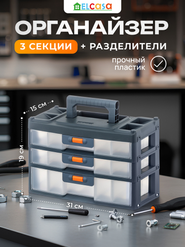 Настольный трёхсекционный органайзер от ELCASA – это универсальное решение для хранения самых разнообразных мелочей и инструментов, например, болтов, саморезов и гаек. Имеет ручку, поэтому удобен для переноса. Выполнен из полипропилена – прочного экологичного пластика. Размер с опущенной ручкой 31х15х19,5 см, высота с поднятой ручкой 24,5 см. Каждая из 3 секций представляет собой ящик, который плотно защёлкивается. Чтобы открыть каждый, нужно нажать и удерживать оранжевую кнопку. 2 верхних ящика имеют внутри по 3 отделения (одно размером 13,5х8,5х4 см, два по 14х10х4 см). 1 нижний ящик имеет одно большое отделение размером 28х14х6 см. В комплекте поставляются съёмные прозрачные разделители (к верхнему ящику идут 2 разделителя 9,5х3,5 см и 2 разделителя 13,5х3,5 см, к среднему ящику идут 2 разделителя 9,5х3,5 см и 2 разделителя 13,5х3,5 см, к одному нижнему ящику идут 4 разделителя размерами по 13,5х5,5 см). Пластиковый контейнер подойдёт для хранения декоративной косметики, а также косметических и маникюрных принадлежностей. Разместите по отсекам лаки, пилочки и пинцеты, а также другие аксессуары для маникюра, чтобы они всегда были под рукой. Многоярусный бокс найдёт своё место и в других частях вашего дома. Рассортируйте мелкие предметы по ярусам, всё будет на своих местах, не потеряется ни один гвоздь, шуруп и другая мелкая деталь. В спальне используйте пластиковую коробку для хранения резинок, заколок или украшений, в прихожей – для ключей. Безопасный пластик в составе позволяет использовать его как аптечку для хранения и сортировки лекарств. Поставьте на рабочий стол дома или на полку в офисе, чтобы хранить канцелярию, зарядные устройства и флешки. В ящички уместится большое количество фломастеров, маркеров и стикеров. Благодаря универсальному дизайну миниатюрный шкафчик впишется в любой интерьер. Не рекомендуется применять абразивные моющие средства. Органайзер от бренда ELCASA станет отличным подарком для тех, кто ценит порядок, удобство и эстетику.