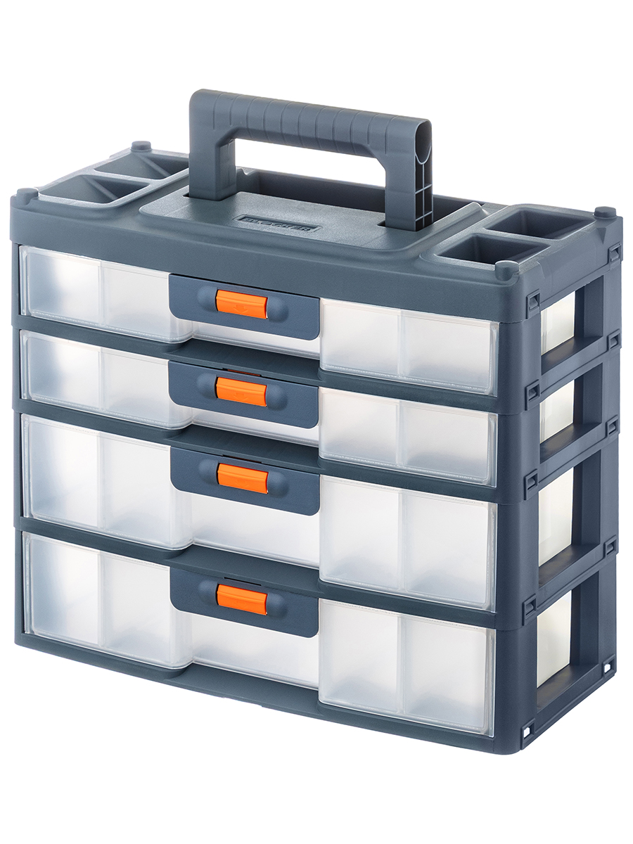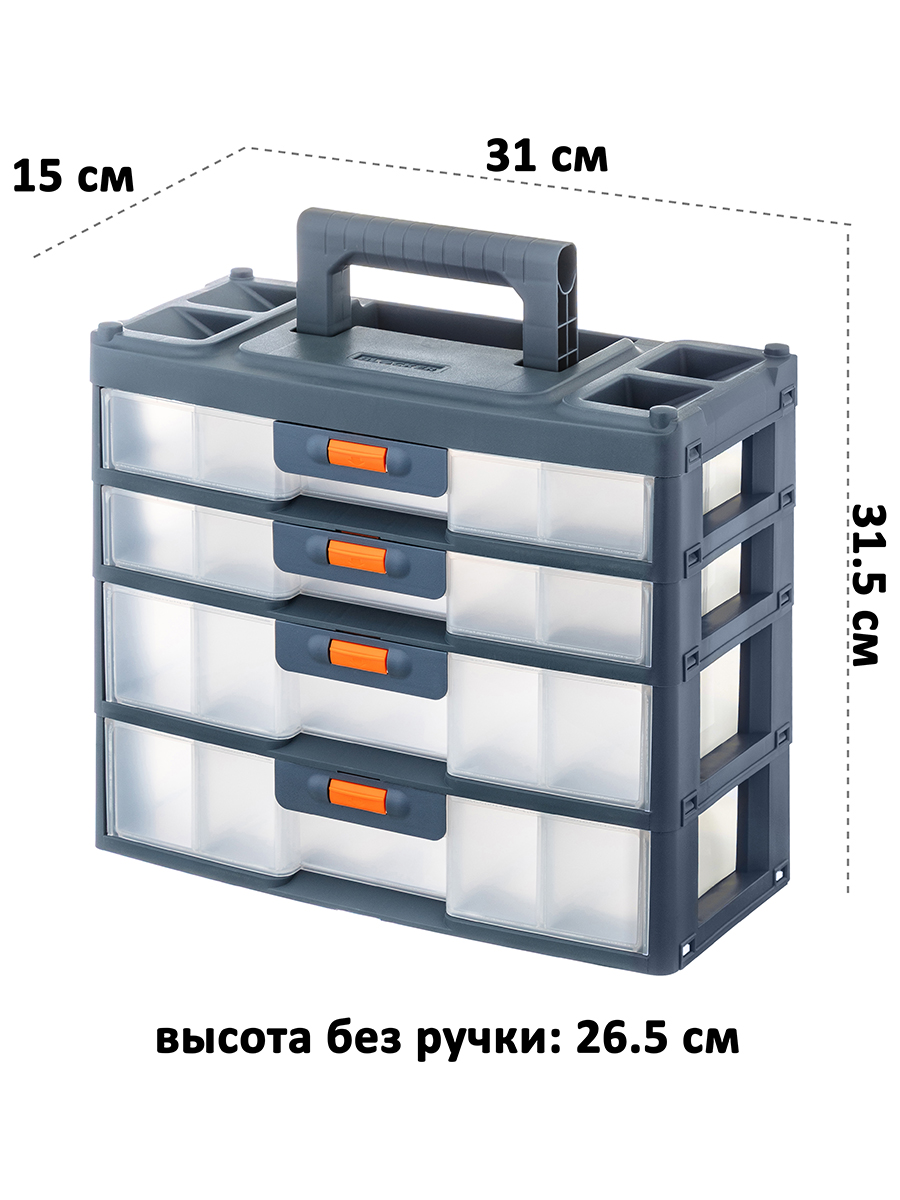 Настольный четырёхсекционный органайзер ELCASA – это универсальное решение для хранения мелочей и инструментов, например, болтов, саморезов и гаек. Имеет ручку, поэтому удобен для переноса. Выполнен из полипропилена – прочного экологичного пластика. Размер с опущенной ручкой 31х15х26,5 см, высота с поднятой ручкой 31,5 см. Каждая из 4 секций представляет собой ящик, который плотно защёлкивается. Чтобы открыть каждый, нужно нажать и удерживать оранжевую кнопку. 2 верхних ящика имеют внутри по 3 отделения (одно размером 13,5х8,5х4 см, два по 14х10х4 см). 2 нижних ящика имеют по одному большому отделению размерами 28х14х6 см. В комплекте поставляются съёмные прозрачные разделители (к верхнему ящику идут 2 разделителя 9,5х3,5 см и 2 разделителя 13,5х3,5 см, ко второму ящику идут 2 разделителя 9,5х3,5 см и 2 разделителя 13,5х3,5 см, к третьему ящику 4 разделителя размерами 13,5х5,5 см, к нижнему ящику 4 разделителя размерами 13,5х5,5 см). Пластиковый контейнер подойдёт для хранения декоративной косметики, а также косметических и маникюрных принадлежностей. Разместите по отсекам лаки, пилочки и пинцеты, а также другие аксессуары для маникюра. Многоярусный бокс найдёт своё место и в других частях вашего дома. Рассортируйте мелкие предметы по ярусам, всё будет на своих местах, не потеряется ни один гвоздь, шуруп и другая мелкая деталь. В спальне используйте пластиковую коробку для хранения резинок, заколок или украшений, в прихожей – для ключей. Безопасный пластик в составе позволяет использовать его как аптечку для хранения и сортировки лекарств. Поставьте на рабочий стол дома или на полку в офисе, чтобы хранить канцелярию, зарядные устройства и флешки. В ящички уместится большое количество фломастеров, маркеров и стикеров. Благодаря универсальному дизайну миниатюрный шкафчик впишется в любой интерьер. Не рекомендуется применять абразивные моющие средства. Органайзер от бренда ELCASA станет отличным подарком для тех, кто ценит порядок, удобство и эстетику.