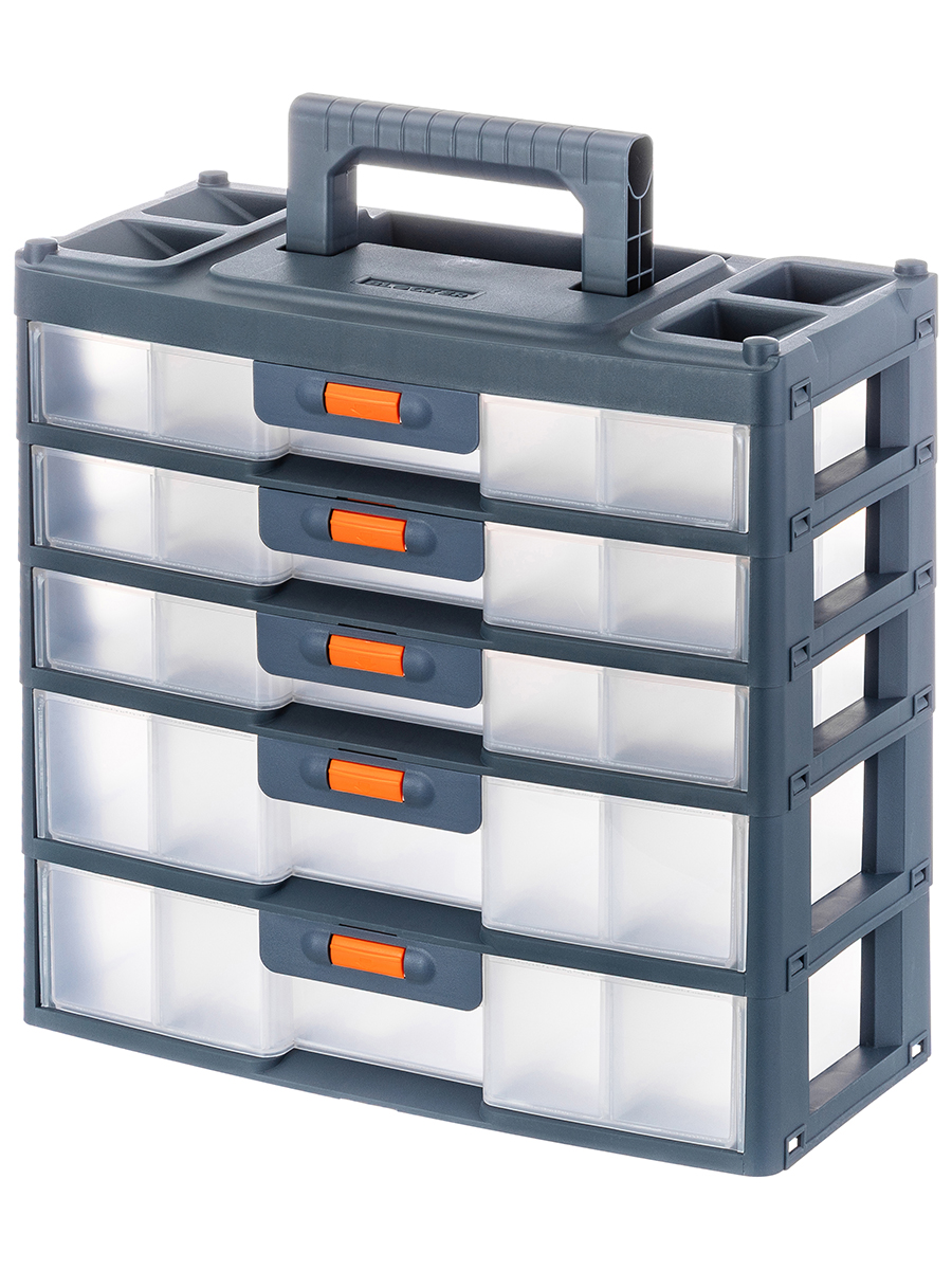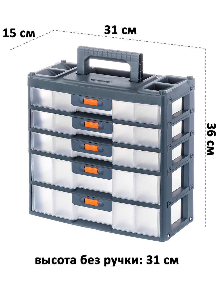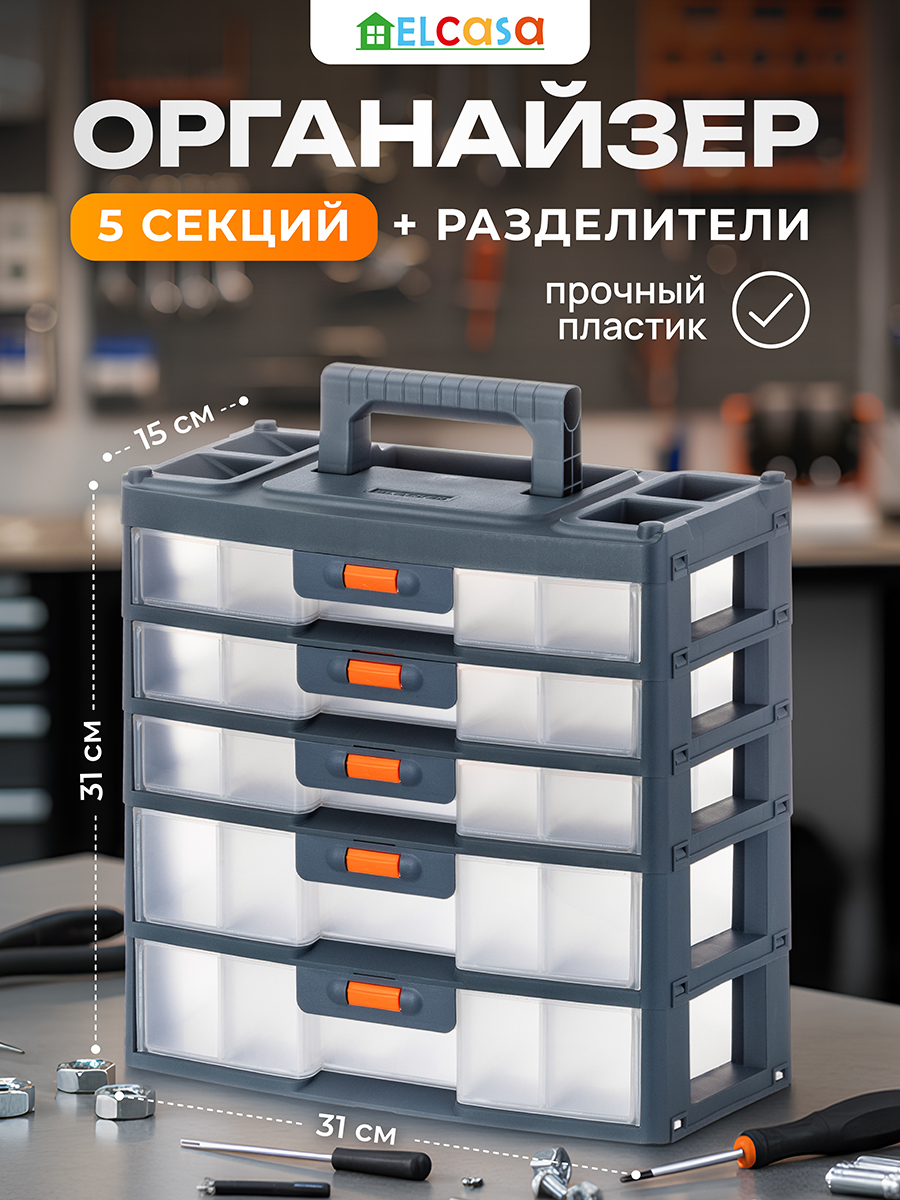 Настольный пятисекционный органайзер от ELCASA – это универсальное решение для хранения самых разнообразных мелочей и инструментов, например, болтов, саморезов и гаек. Имеет ручку, поэтому удобен для переноса. Выполнен из полипропилена – прочного экологичного пластика. Размер с опущенной ручкой 31х15х31 см, высота с поднятой ручкой 36 см. Каждая из 5 секций представляет собой ящик, который плотно защёлкивается. Чтобы открыть каждый, нужно нажать и удерживать оранжевую кнопку. 3 верхних ящика имеют внутри по 3 отделения (одно размером 13,5х8,5х4 см, два по 14х10х4 см). 2 нижних ящика имеют по одному большому отделению размером 28х14х6 см. В комплекте поставляются съёмные прозрачные разделители (к каждому из трёх верхних ящичков идут по 2 разделителя 9,5х3,5 см и 2 разделителя 13,5х3,5 см, к нижним двум ящикам по 4 разделителя размерами 13,5х5,5 см). Пластиковый контейнер подойдёт для хранения декоративной косметики, а также косметических и маникюрных принадлежностей. Разместите по отсекам лаки, пилочки и пинцеты, а также другие аксессуары для маникюра, чтобы они всегда были под рукой. Многоярусный бокс найдёт своё место и в других частях вашего дома. Рассортируйте мелкие предметы по ярусам, всё будет на своих местах, не потеряется ни один гвоздь, шуруп и другая мелкая деталь. В спальне используйте пластиковую коробку для хранения резинок, заколок или украшений, в прихожей – для ключей. Безопасный пластик в составе позволяет использовать его как аптечку для хранения и сортировки лекарств. Поставьте на рабочий стол дома или на полку в офисе, чтобы хранить канцелярию, зарядные устройства и флешки. В ящички уместится большое количество фломастеров, маркеров и стикеров. Благодаря универсальному дизайну миниатюрный шкафчик впишется в любой интерьер. Не рекомендуется применять абразивные моющие средства. Органайзер от бренда ELCASA станет отличным подарком для тех, кто ценит порядок, удобство и эстетику.