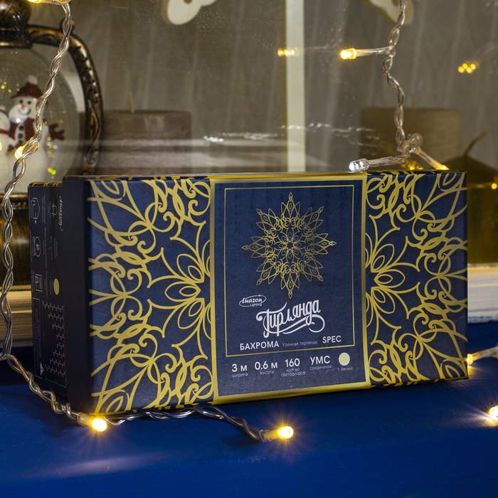 Гирлянда «Бахрома» 3×0.6 м, IP44, УМС, прозрачная нить, 160 LED, свечение тёплое белое, мерцание белым, 220 В