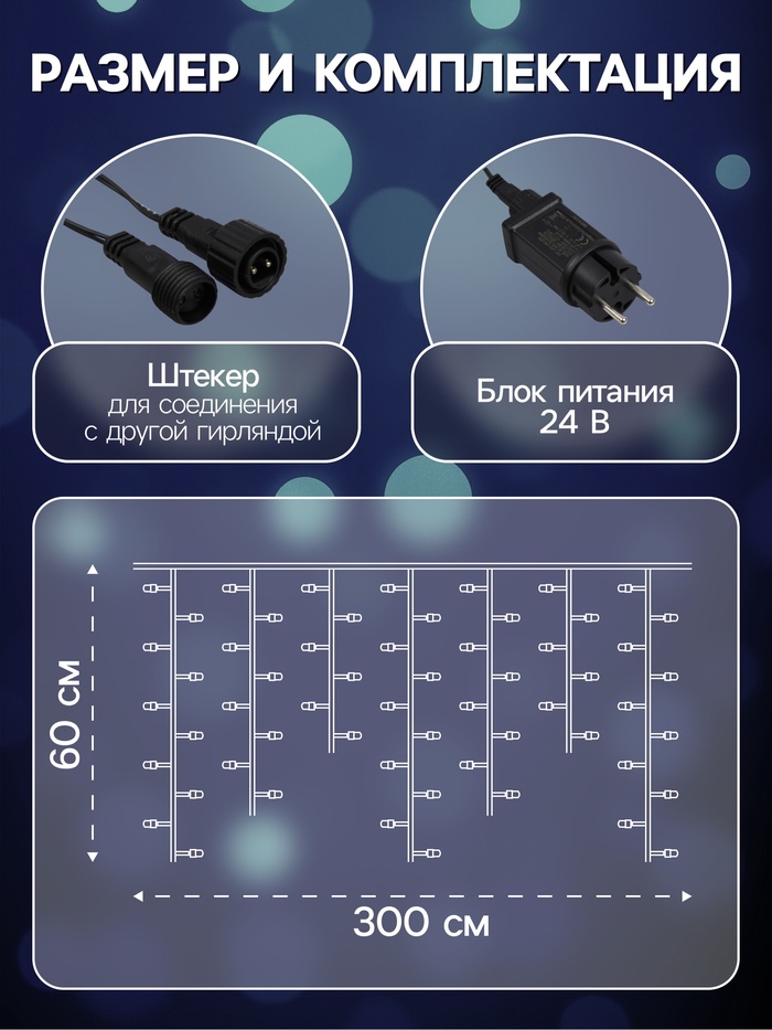 Гирлянда «Бахрома» 3×0.6 м, IP44, УМС, тёмная нить, 100 LED, свечение белое, мерцание, 24 В