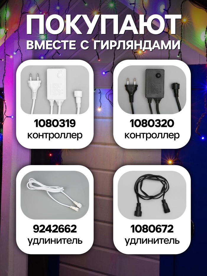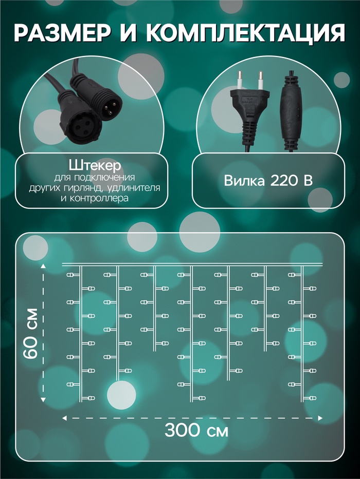 [Бахрома SPEC. LED 5 мм. Утолщенный ПВХ. УМС, устойчивость к экстремальным условиям122][IP 44. Защита от объектов диаметром больше 1 мм. Защита от брызг воды со всех направлений122][Цвета свечения: мульти, белый, тёплый белый, синий, фиолетовый, желтый, зеленый, красный. Цвета нити: черный, белый, прозрачный122][Универсальная монтажная система УМС. Раскрутите нити гирлянды чтобы увеличить длину122]Комплектация