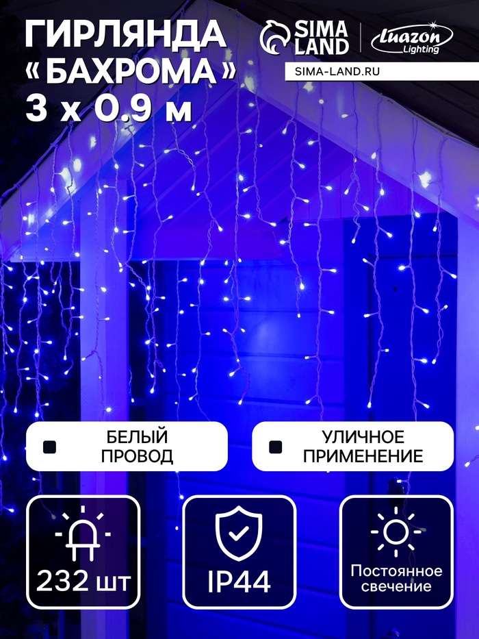 Гирлянда «Бахрома» 3×0.9 м, IP44, УМС, белая нить, 232 LED, свечение синее, 220 В