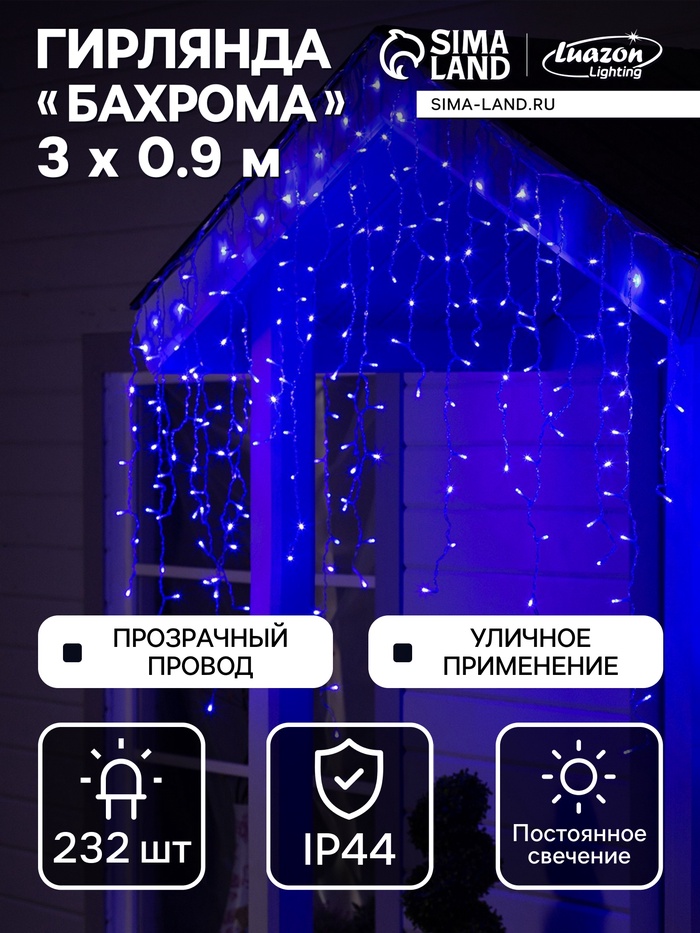 Гирлянда «Бахрома» 3×0.9 м, IP44, УМС, прозрачная нить, 232 LED, свечение синее, 220 В