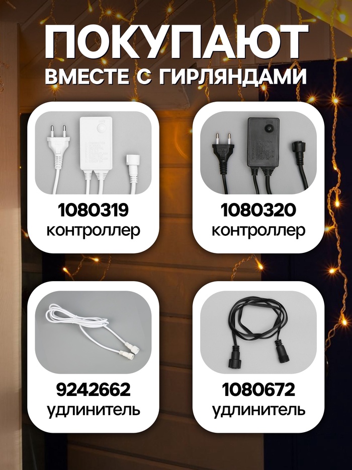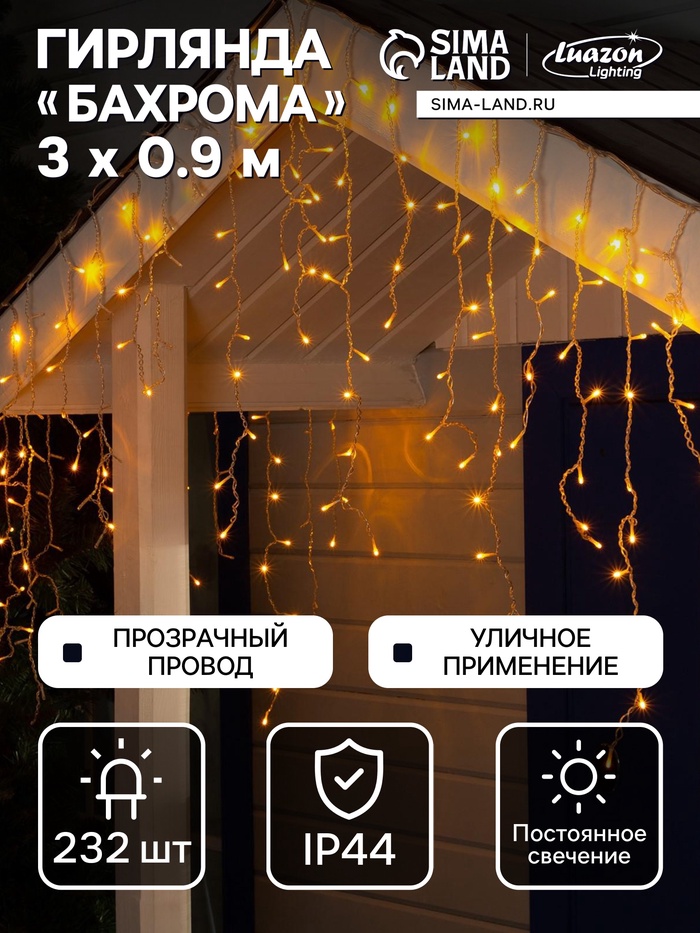 Гирлянда «Бахрома» 3×0.9 м, IP44, УМС, прозрачная нить, 232 LED, свечение жёлтое, 220 В