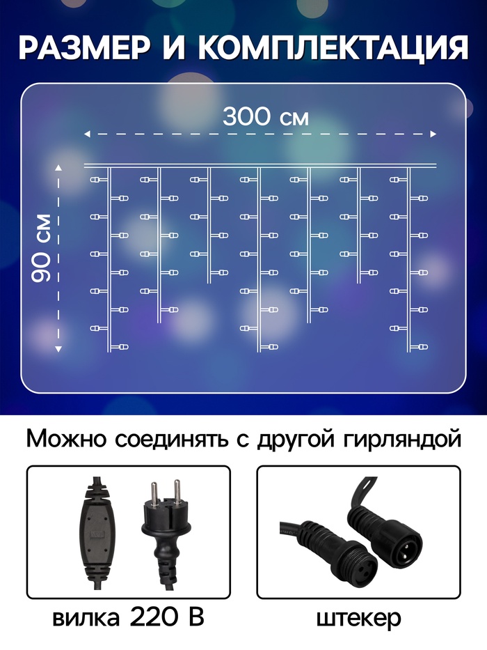 [Декоративная светодиодная гирлянда, состоящая из основного горизонтольного провода, к которому прикреплены свисающие вниз световые нити разной длины. Такой дизайн отлично подходит в качестве декора входных зон, для украшения окон, фасадов зданий, дверных проёмов и стен.122][IP 65 . Полная защита от пыли . Защита от водяных струй с любого направления122][Цвета свечения: мульти, белый, тёплый белый, синий, фиолетовый, жёлтый, зеленый, красный. Цвета нити: черный, белый, прозрачный. УМС универсальная монтажная система122][УМС универсальная монтажная система122]Комплектация