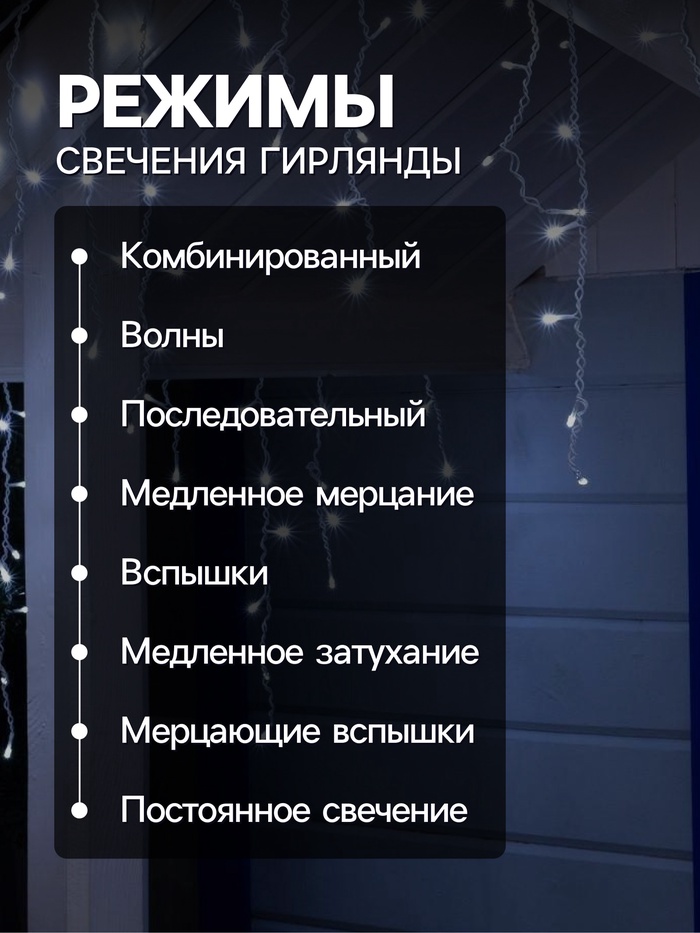 Гирлянда «Бахрома» 4×0.6 м, IP44, белая нить, 180 LED, свечение белое, 8 режимов, 220 В