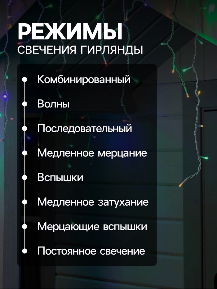 Гирлянда «Бахрома» 4×0.6 м, IP44, белая нить, 180 LED, свечение мульти, 8 режимов, 220 В