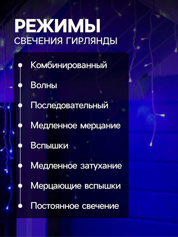 Гирлянда «Бахрома» 4×0.6 м, IP44, белая нить, 180 LED, свечение синее, 8 режимов, 220 В