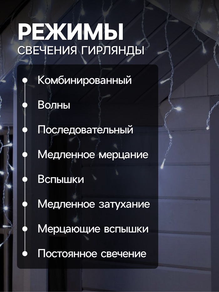 Гирлянда «Бахрома» 4×0.6 м, IP44, прозрачная нить, 180 LED, свечение белое, 8 режимов, 220 В