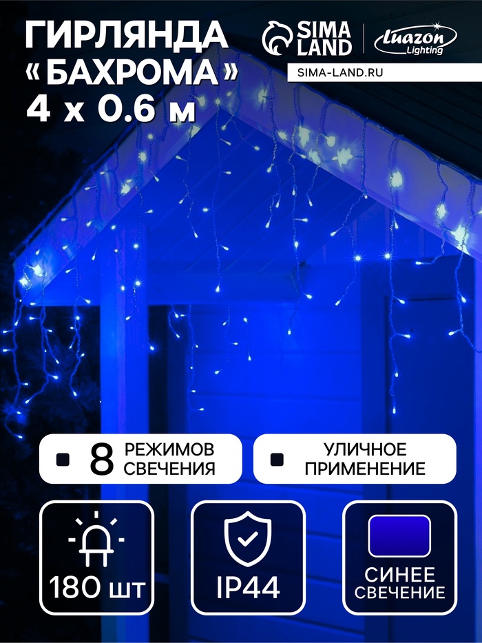 Гирлянда «Бахрома» 4×0.6 м, IP44, прозрачная нить, 180 LED, свечение синее, 8 режимов, 220 В