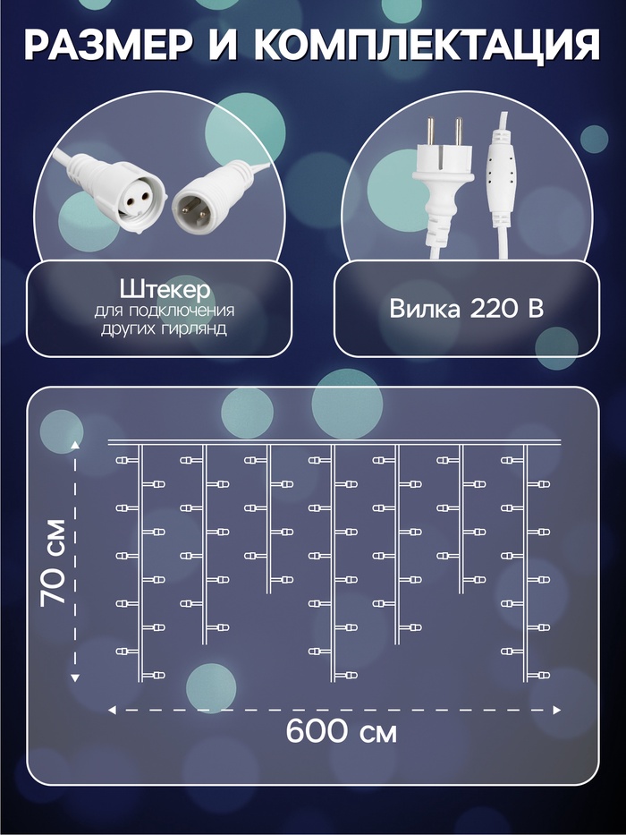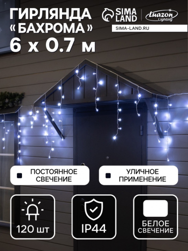 Гирлянда «Бахрома» 6×0.7 м, IP44, УМС, белая нить, 120 LED, свечение белое, 220 В