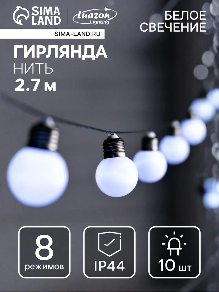 Гирлянда «Нить», 2.7 м, с насадками «Белые шары», уличная, IP44, 10 LED, 8 режимов, солнечная батарея, тёмная нить, свечение белое