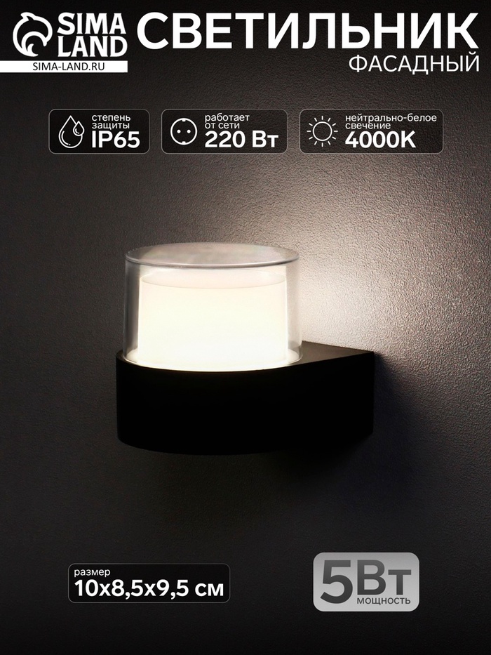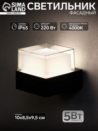 Светильник фасадный «Гранд», 5 Вт, 4000К, IP65, 220 В, пластиковый корпус, чёрный, свечение нейтрально-белое