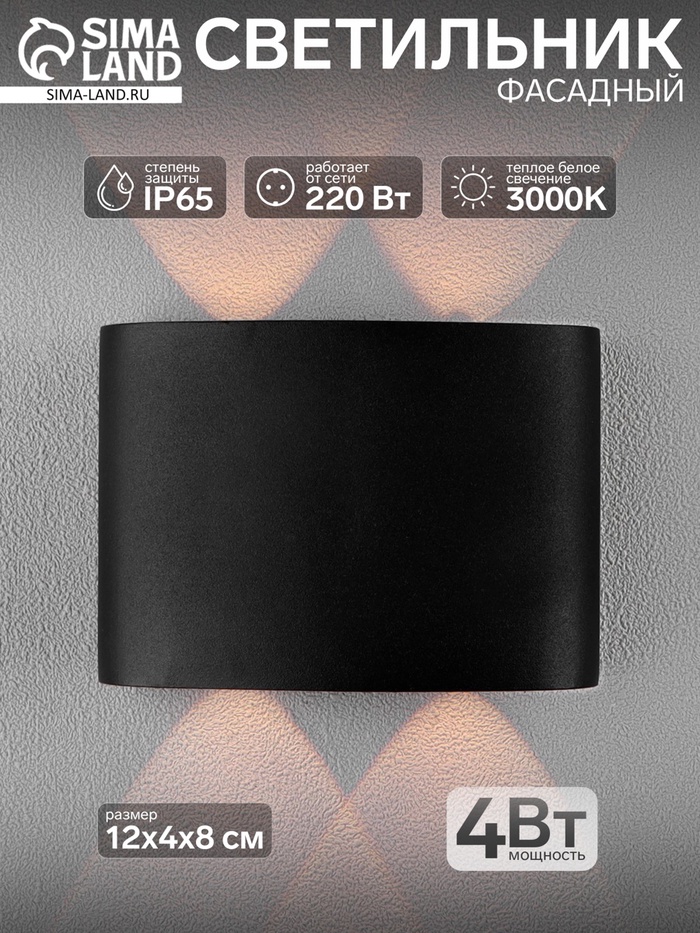 Светильник фасадный «Полусфера», 4 Вт, 3000К, 2 луча, IP65, 220 В, металлический корпус, чёрный, свечение тёплое белое