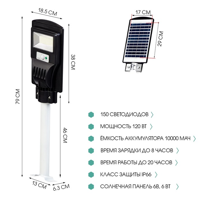 Уличный настенный фонарь, изготовленный из ABS-пластика, идеально подходит для освещения больших площадей до 150 квадратных метров. Он работает от встроенного аккумулятора большой емкости (10 000 мАч). Комплектация включает пульт дистанционного управления, крепежные винты и фонарную трубу для установки на нужной высоте. Мощный (120 Ватт) фонарь оснащен 150 светодиодами SMD LED 2835, обеспечивающими яркий и равномерный световой поток. Время зарядки от 5 до 8 часов, а солнечная панель с напряжением до 6 В, и мощностью 6 Вт обеспечивает зарядку от солнечной энергии в течение дня. Поставляется в надежной коробке для безопасной транспортировки и хранения. С помощью пульта дистанционного управления можно регулировать яркость, что делает использование фонаря еще более удобным и функциональным.