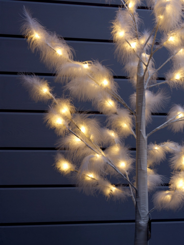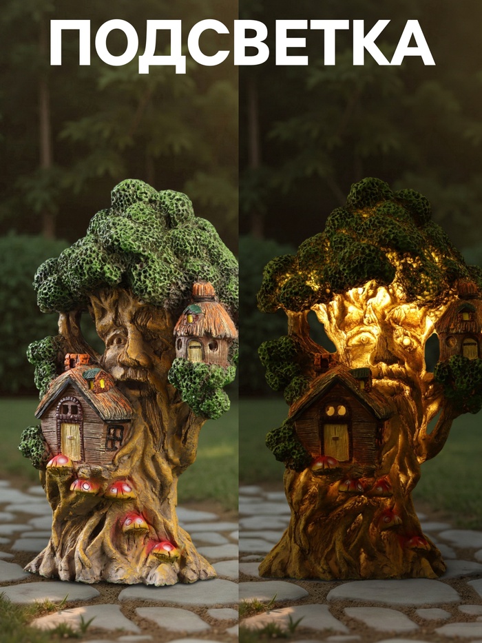 * Многоярусная конструкция: фонарь объединяет основание в виде дерева и домик в кроне. Такое строение даёт объёмный свет — освещает пространство сверху и снизу одновременно.
