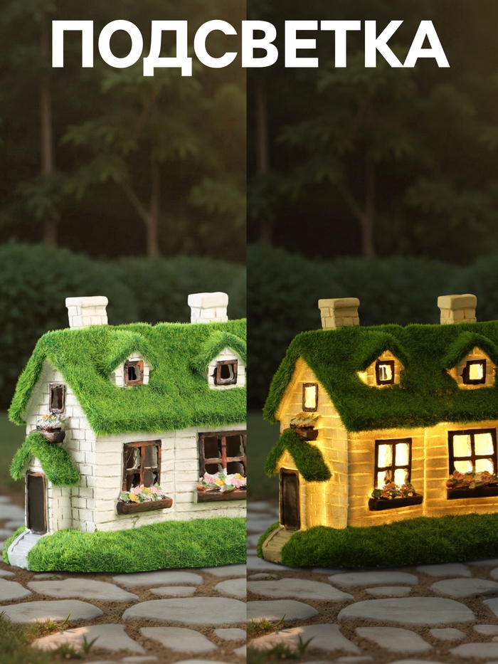 * Светильник в форме домика: детализированная композиция с окошками, дверью и элементами крыши напоминает сказочное жилище. Днём это — декоративный объект, вечером — источник тёплого света.