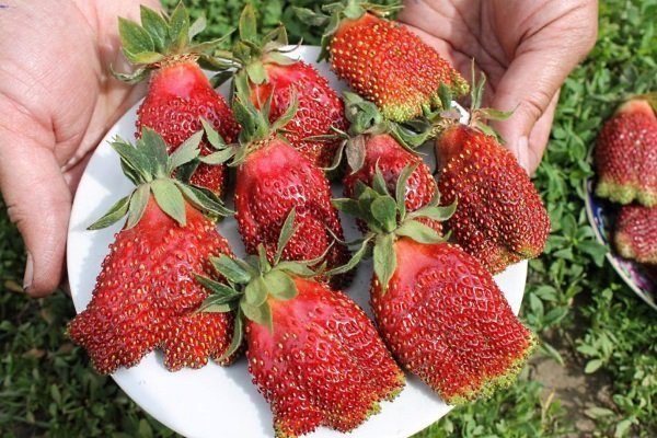 Плоды. Вес и размер зависит от времени созревания. Форма – вытянутая, сплюснутая. Ягоды выглядят необычно – они раздваиваются на концах. Цвет – тёмно-красный, с пурпурным оттенком.