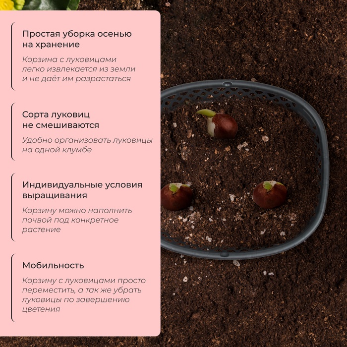 Для декоративных посадок: корзина помогает создавать аккуратные цветочные группы и защищает луковицы от повреждений. Осенью контейнер легко извлечь из земли для пересадки или хранения луковиц. Решение подходит для оформления клумб, рабаток и других ландшафтных элементов.