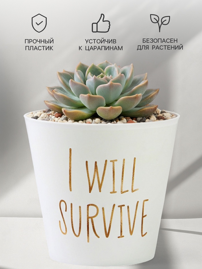 * Текстовый дизайн: фраза «Я выживу» нанесена контрастным шрифтом. Надпись расположена на фронтовой части кашпо и отлично читается.
