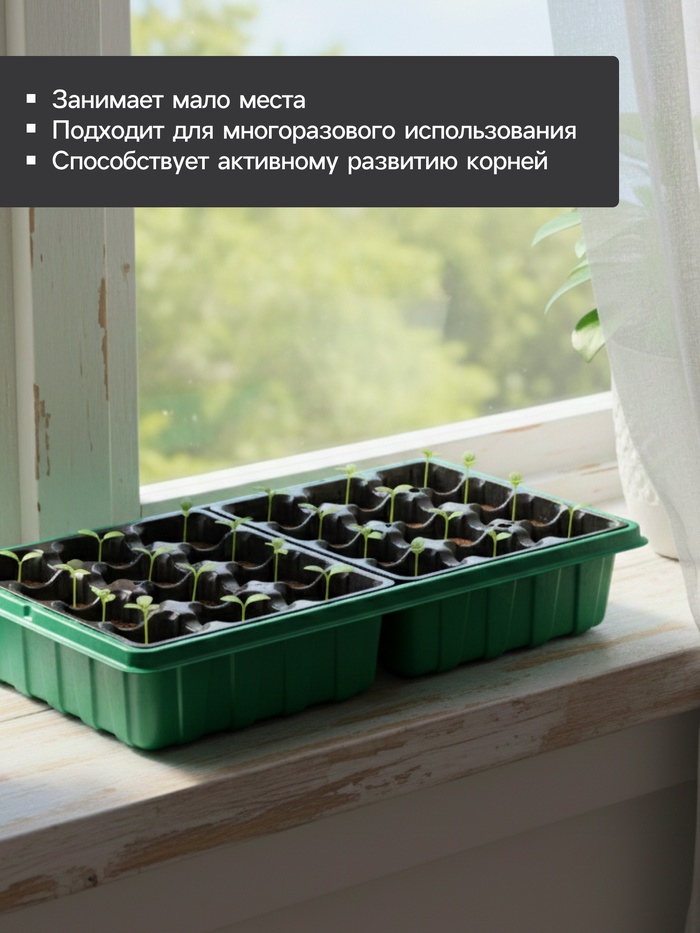 Для экономного размещения: набор подходит для садоводов с ограниченным пространством для рассады. Компактные размеры ячеек и таблеток позволяют разместить много растений на маленькой площади. Решение оптимально для тех, кто выращивает большое количество рассады на начальном этапе.