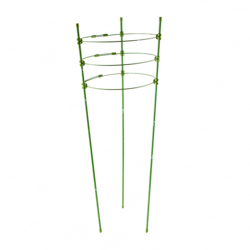 Кольцевая опора для садовых и комнатных цветов – практичный предмет для выращивания растений. Выполняет функцию опоры для неокрепших стеблей, которые могут ломаться под весом массивных соцветий. Процесс установки крайне прост и не отнимет много времени. Маскирующий зелёный цвет опоры делает её практически незаметной на фоне листьев и стеблей, поэтому можно не беспокоиться, что её вид нарушит гармонию и порядок сада. Опора состоит из 4-х колец и 3-х опор, расширяющихся к верху. Высота – 90 см.