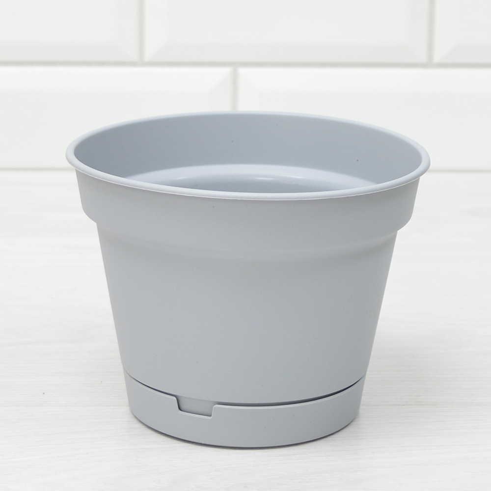 Горшок цветочный Mint 1,2л d150мм, серый состоит из корпуса и интегрированного поддона, не выступающего за дно горшка.