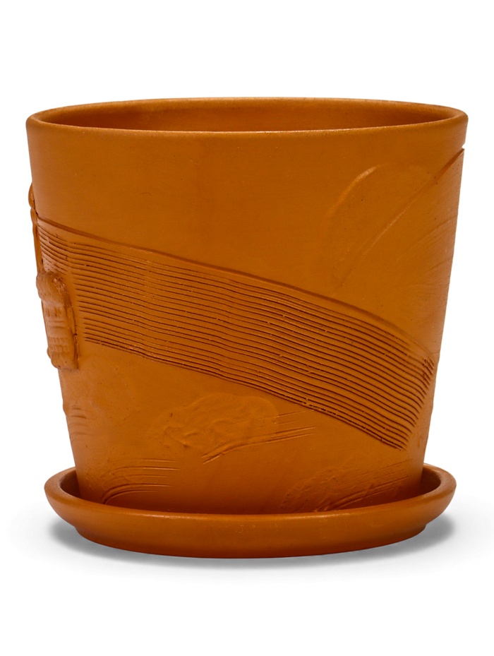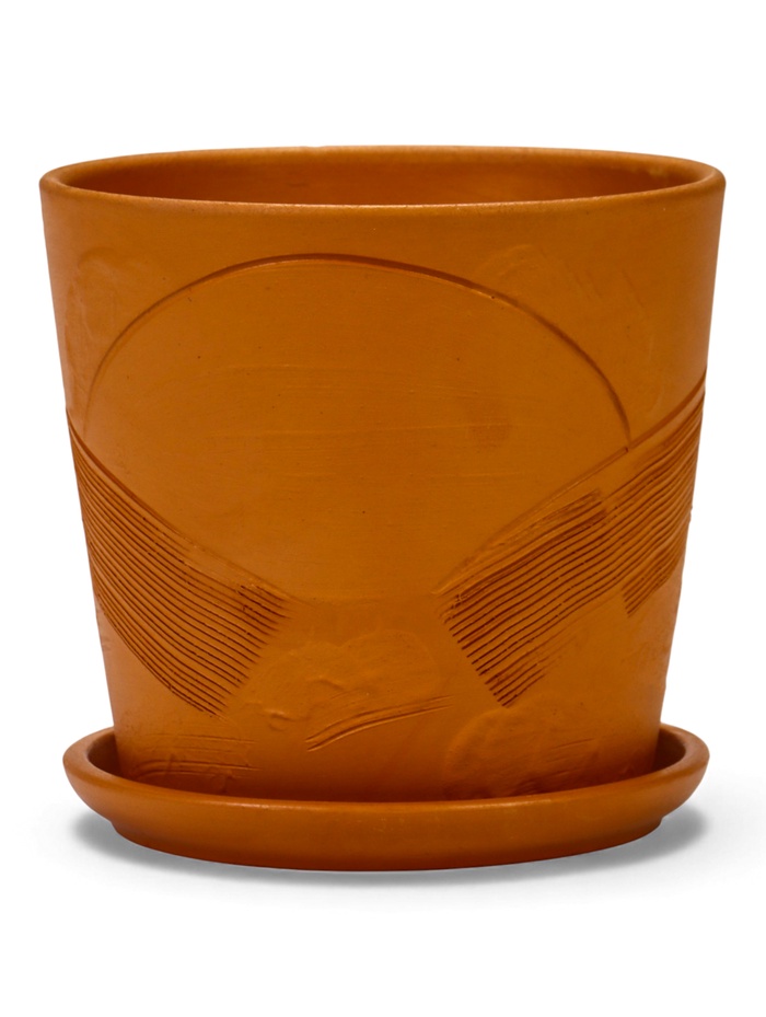 * Дизайн с рельефным узором: стенки украшает характерный объёмный рисунок. Такой декор добавляет поверхности тактильность и визуальный интерес, делая горшок заметным элементом декора.
