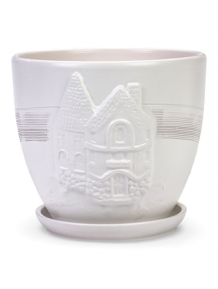 Керамический горшок с поддоном «Голландия», 5 л, белый — это настольная модель с рельефным декором. Его классический цвет и вместительный объём создают солидный и универсальный образ для крупных комнатных растений.