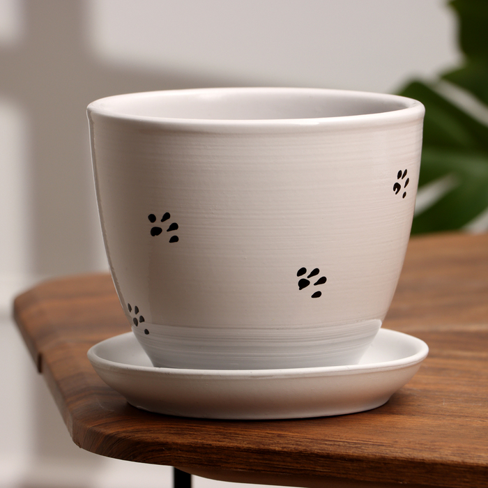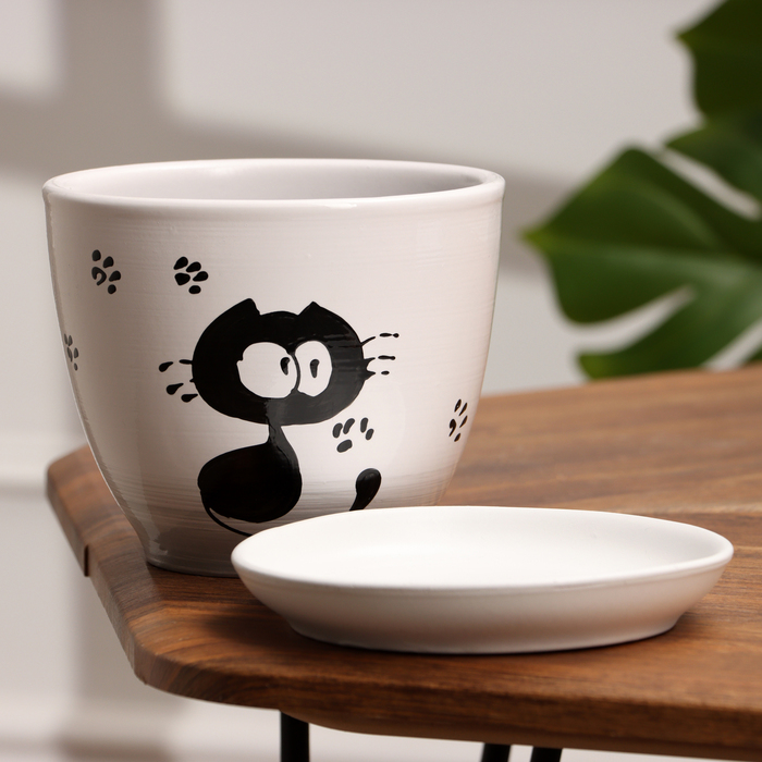 Горшок для цветов «Кот», 1 л, d=15 см, h=13 см, керамика, с поддоном, белый