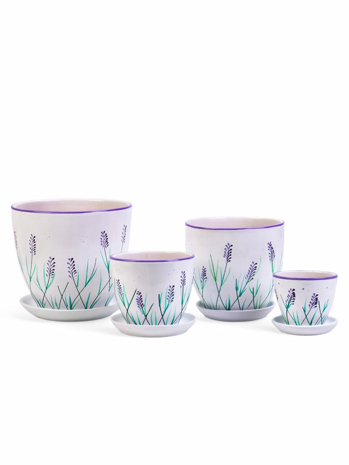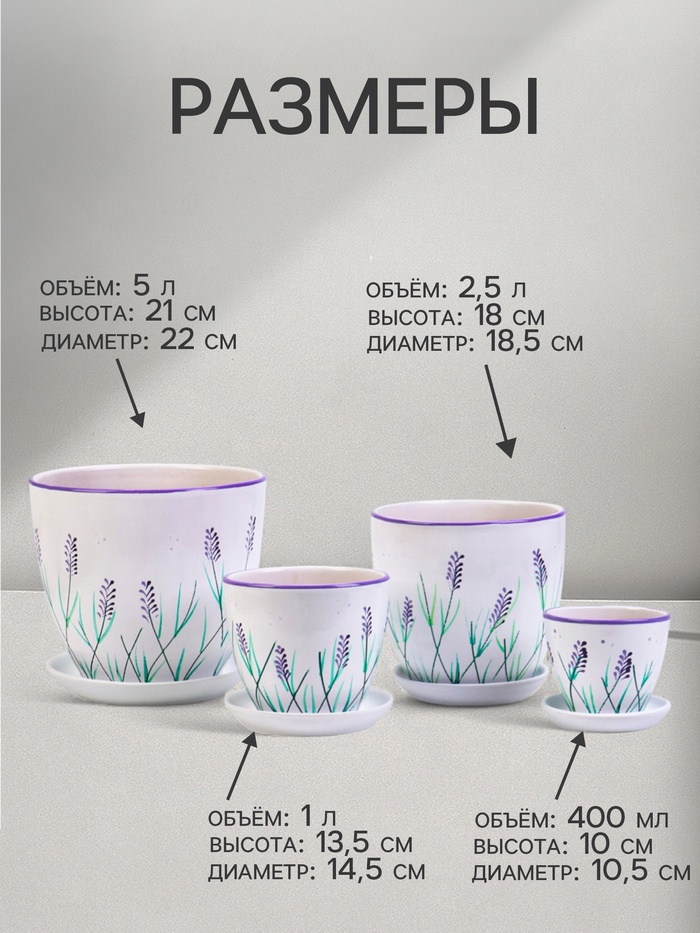 Горшок для цветов «Лаванда», керамика, с поддоном, набор 4 шт.: 400 мл, 1 л, 2.5 л, 5 л